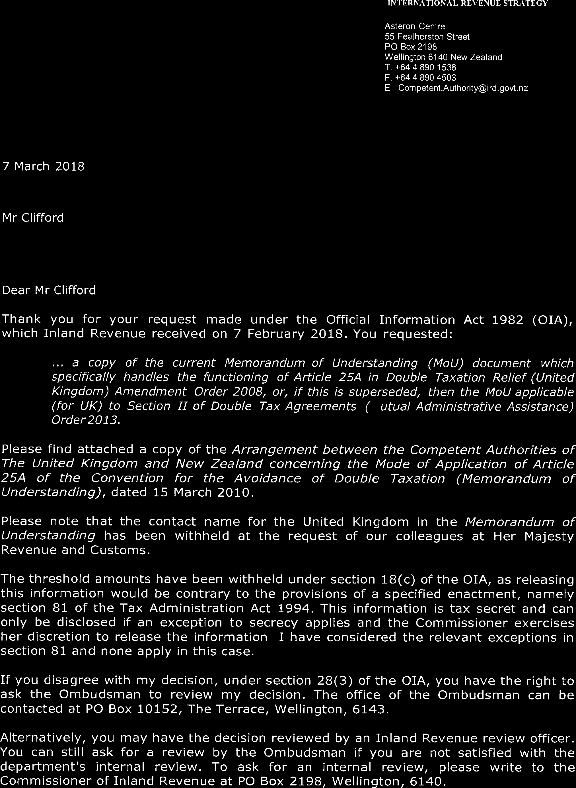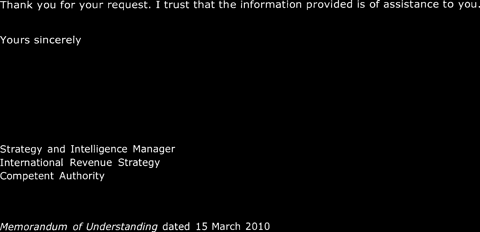 Memorandum of Understanding specific to Article 25A in DTA Relief (United Kingdom) Amendment Order 2008, or MAA (2013)