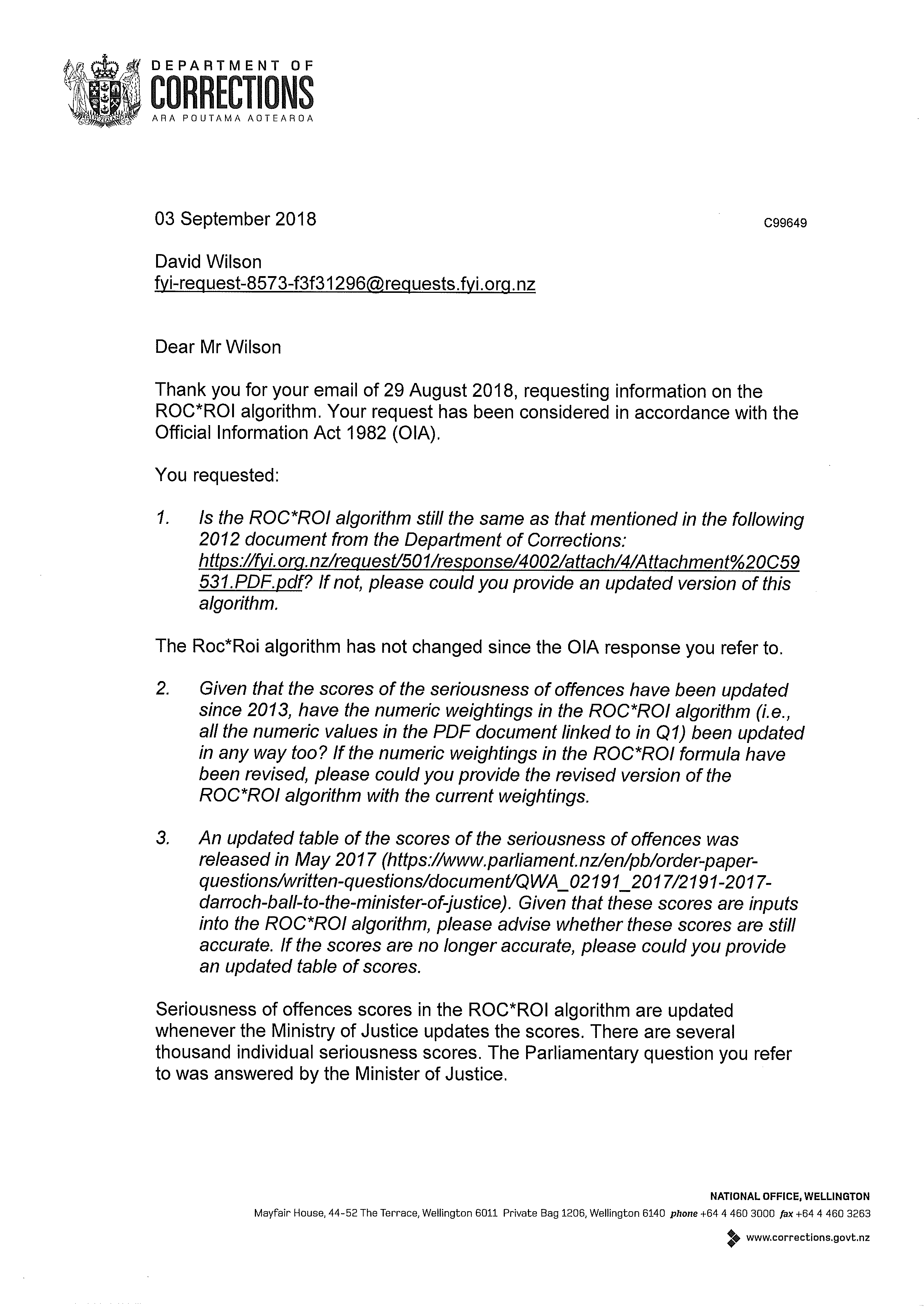 Updated information regarding ROC*ROI algorithm and Seriousness of Offence Scores