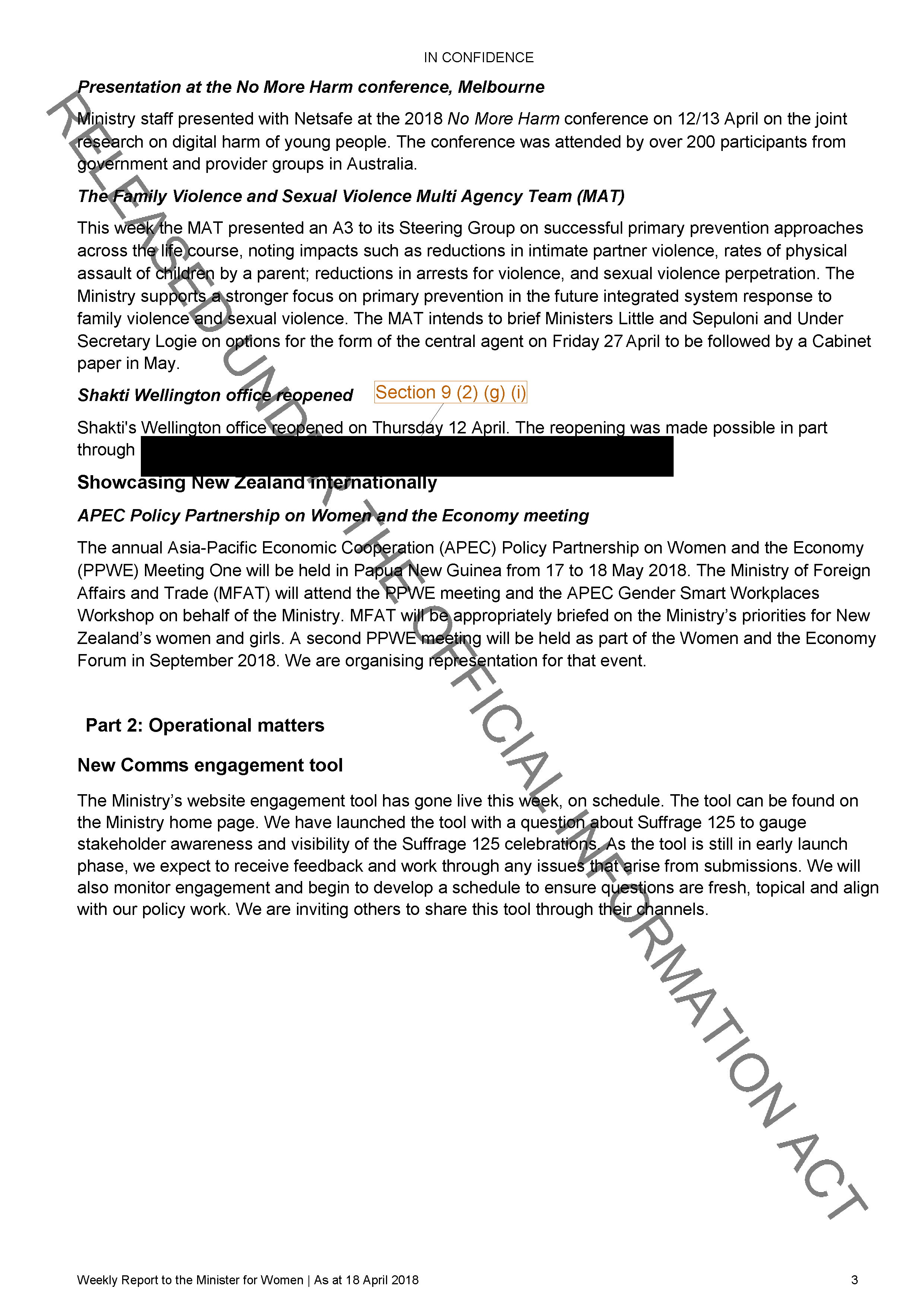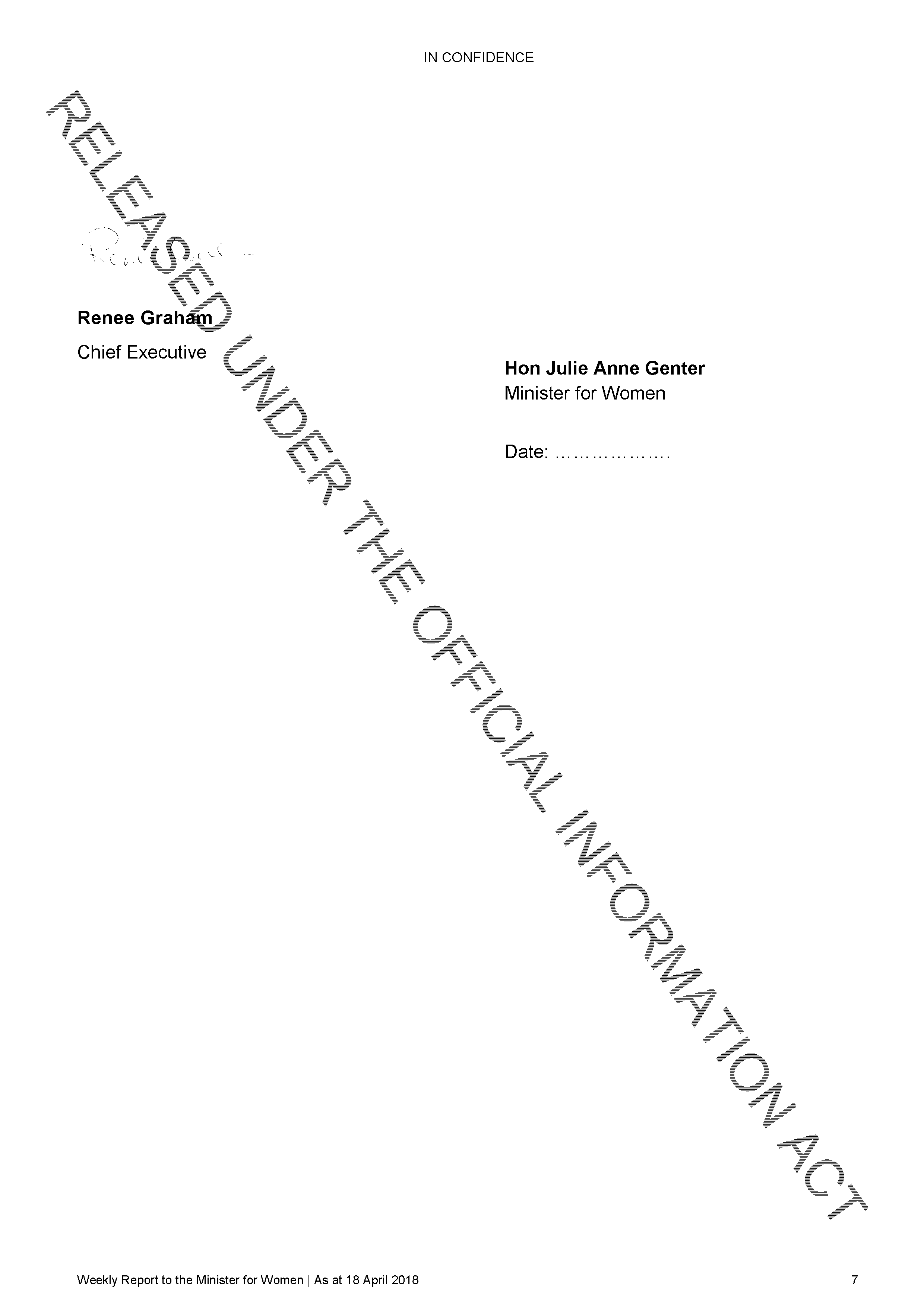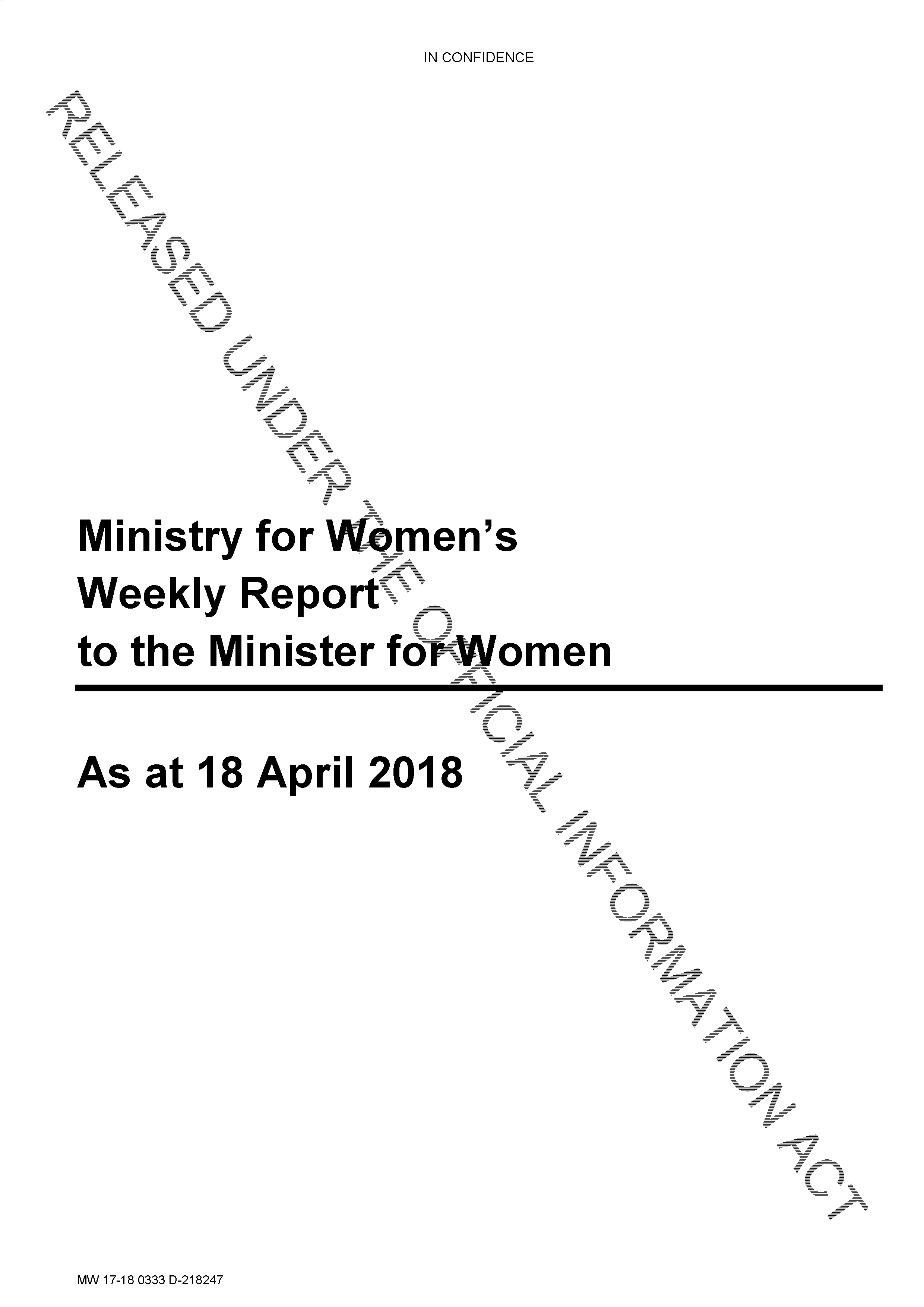 Weekly briefings for "Minister for Women" portfolio: Feb - Aug 2018
