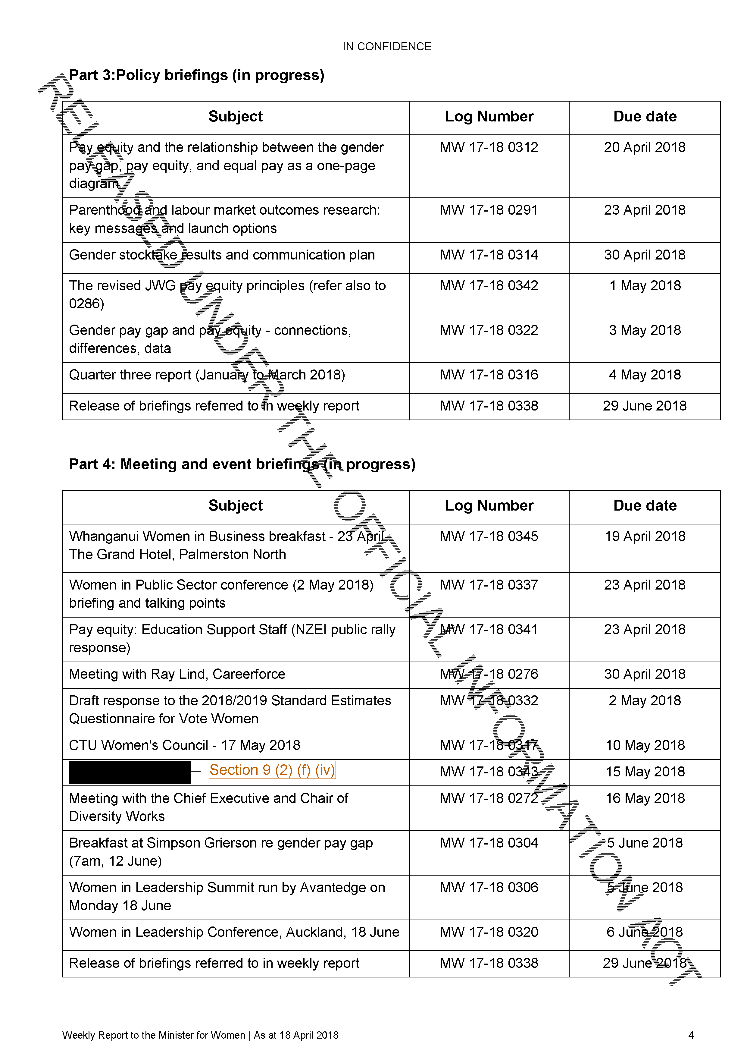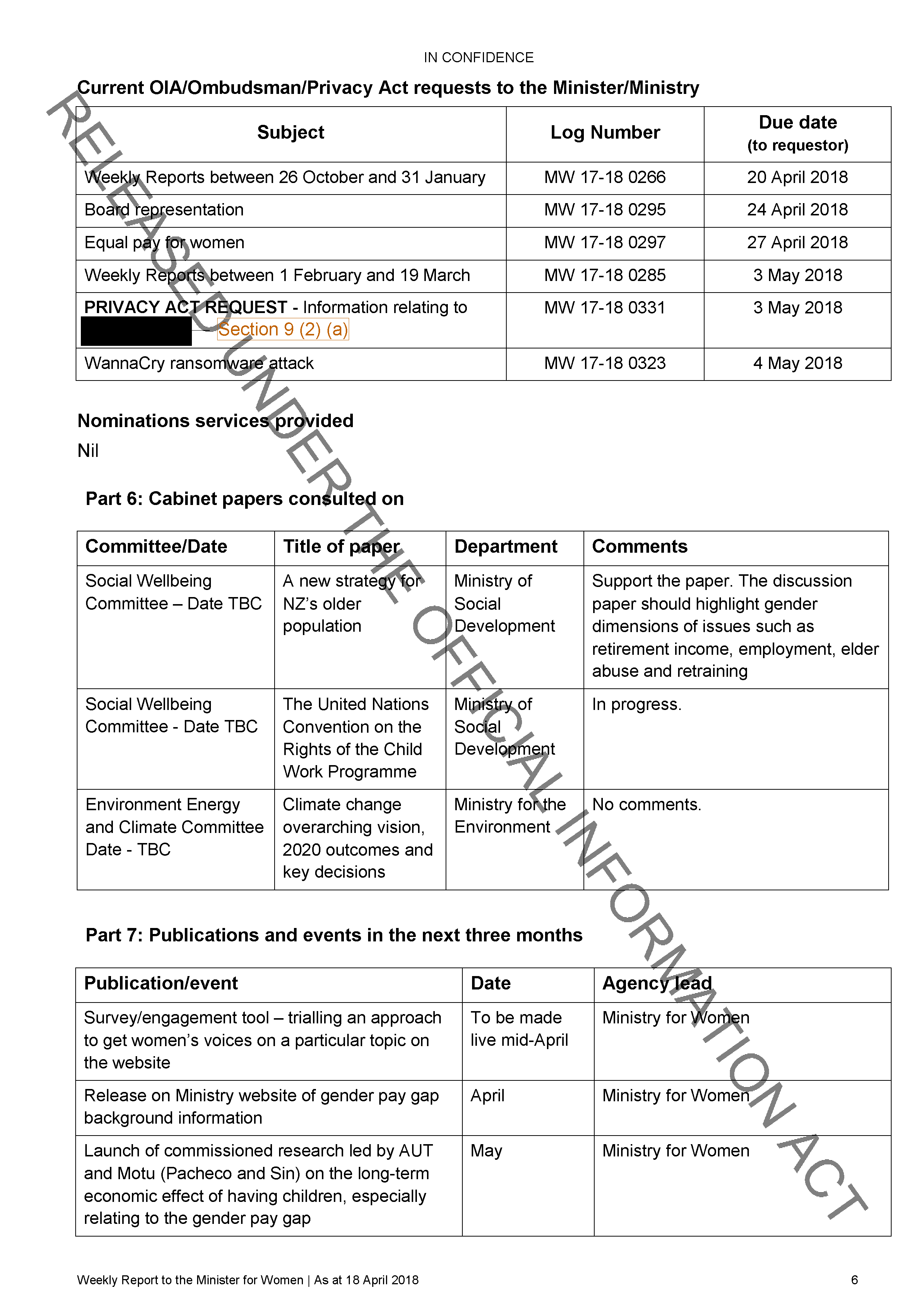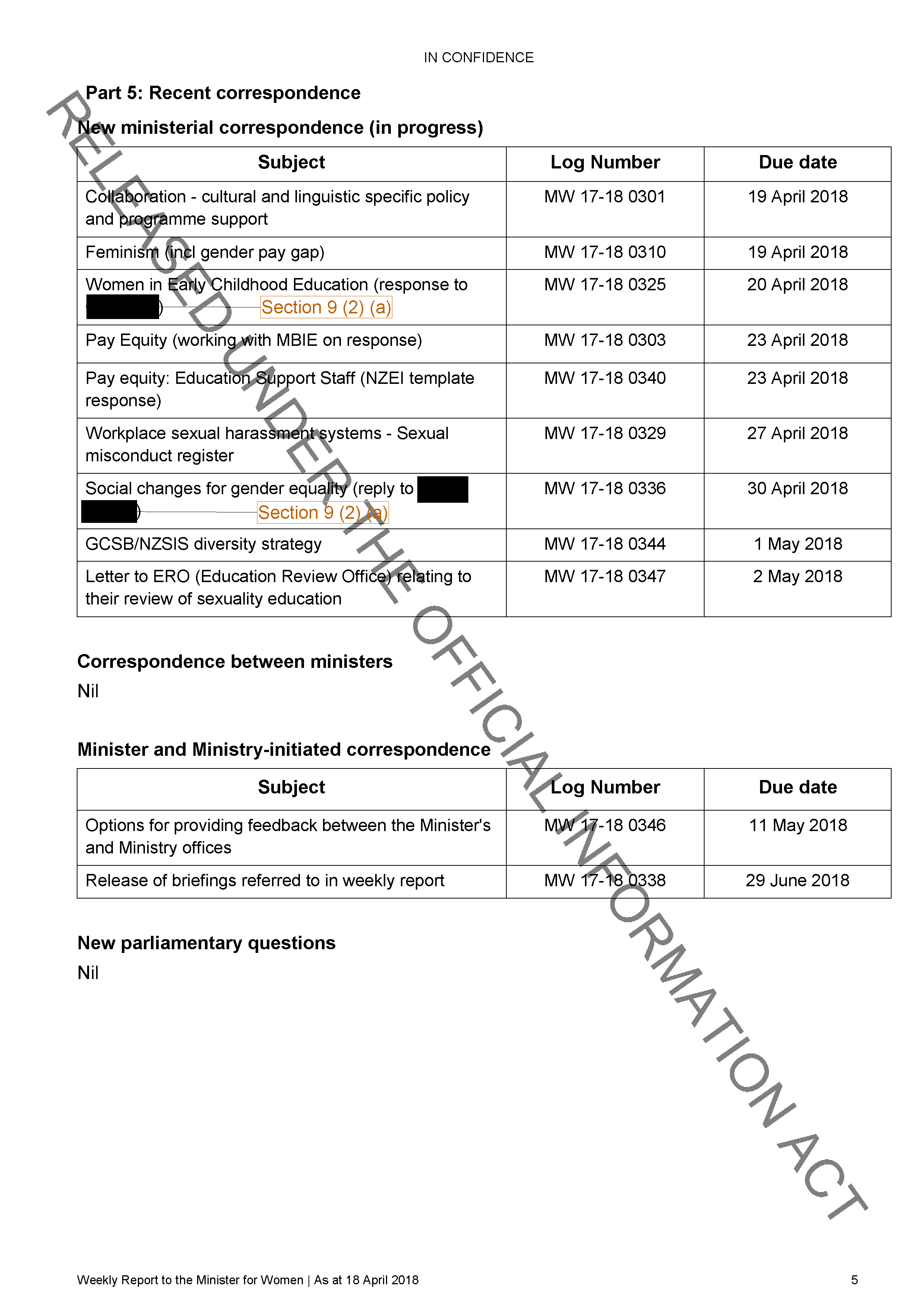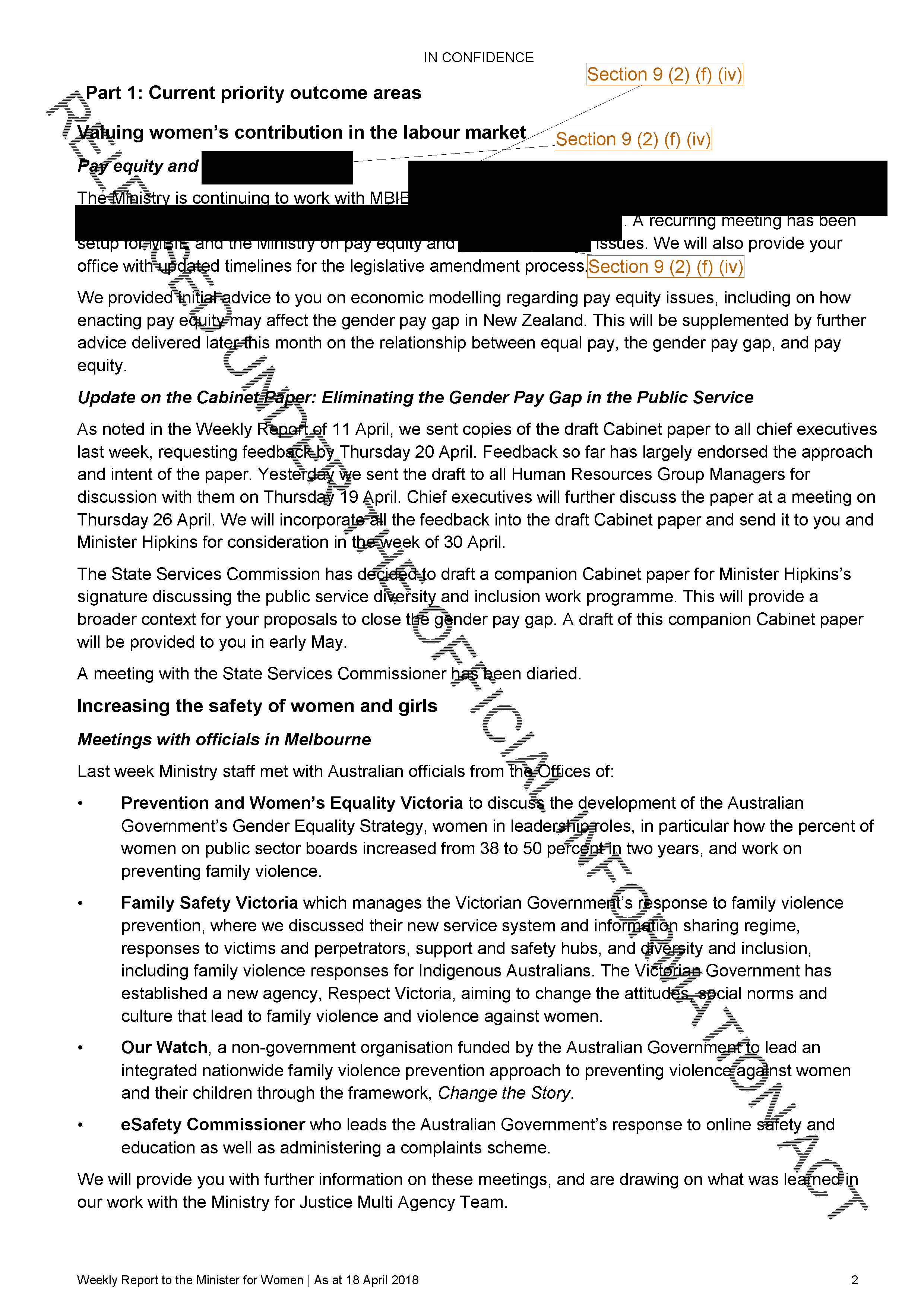 Weekly briefings for "Minister for Women" portfolio: Feb - Aug 2018