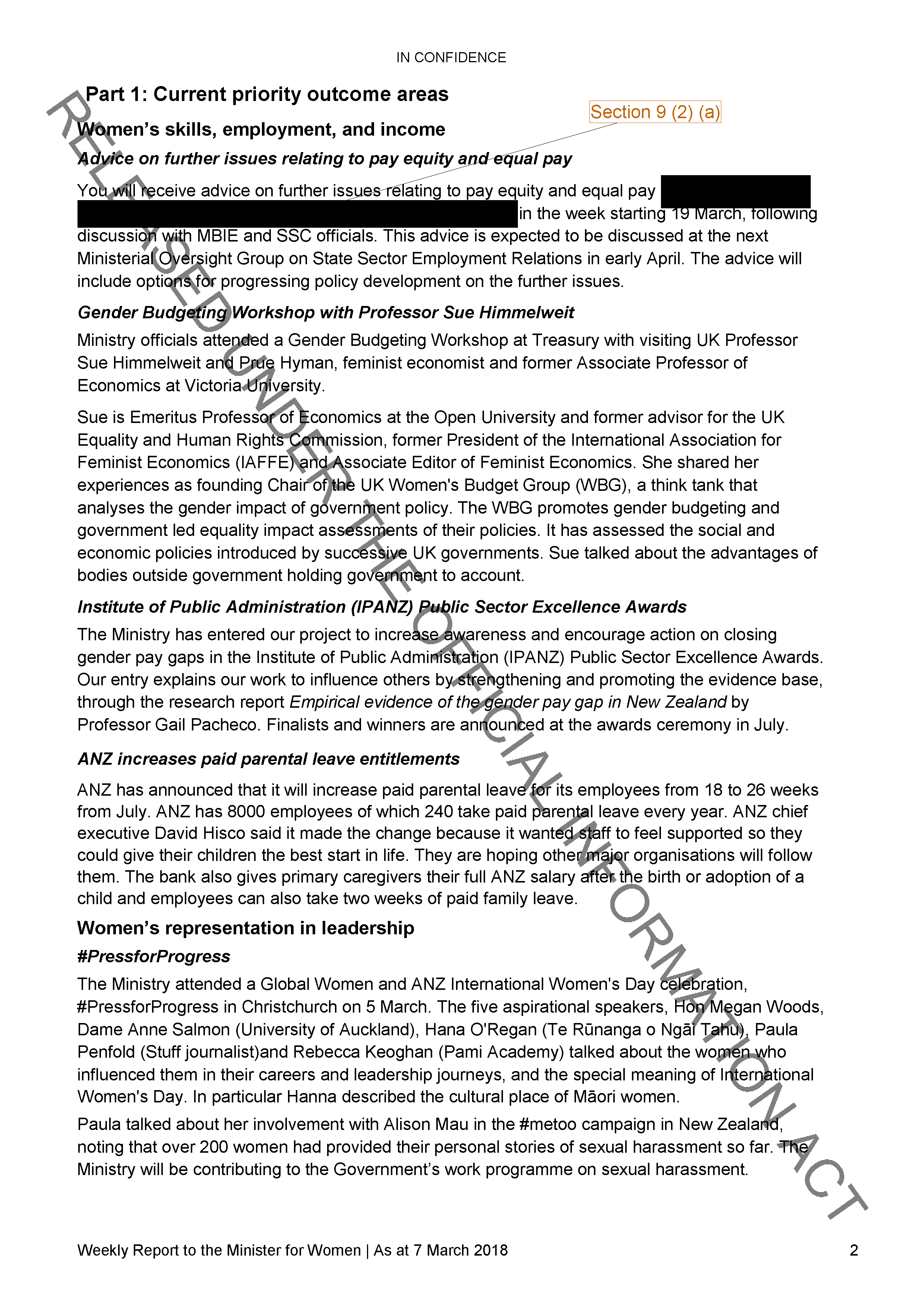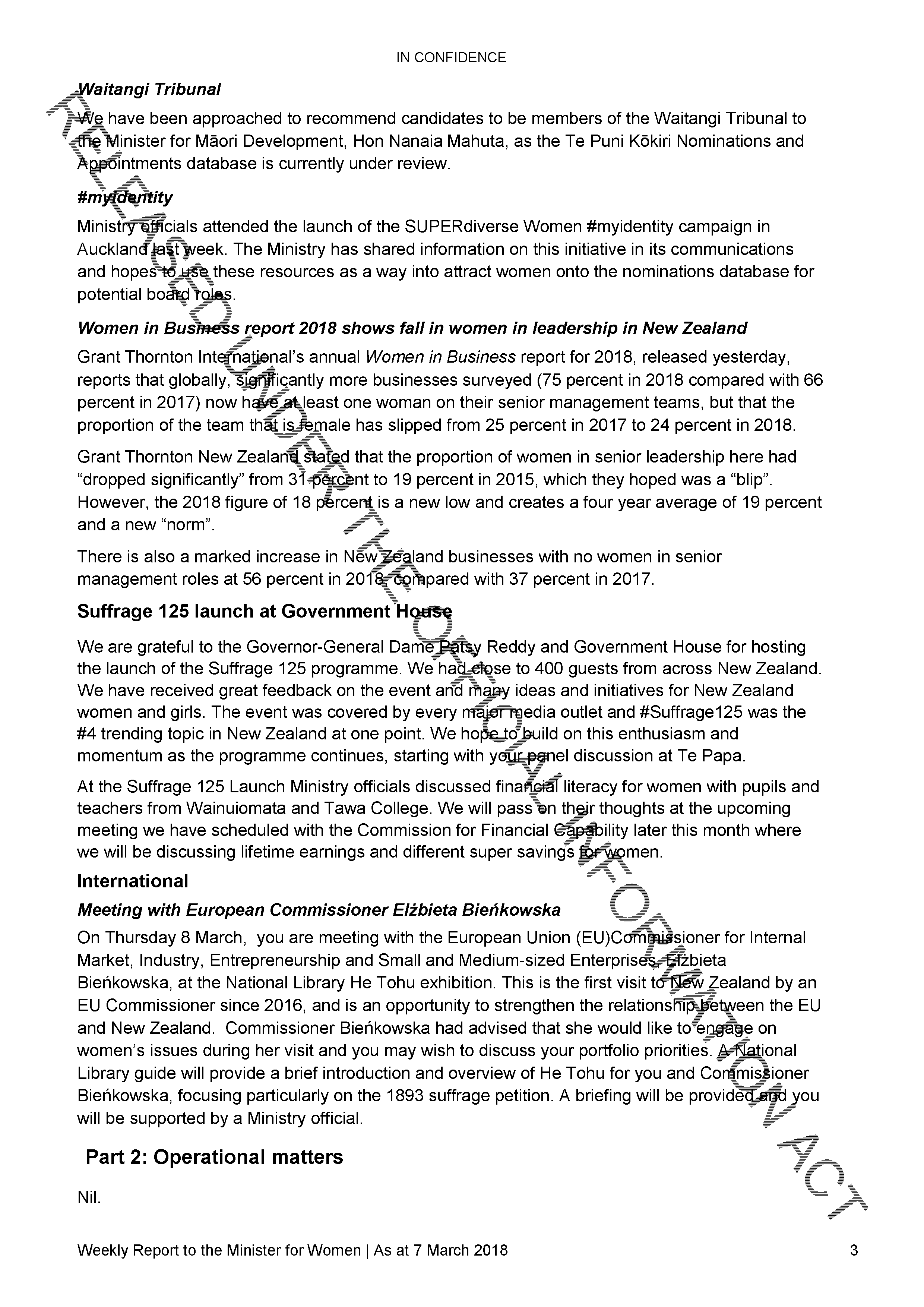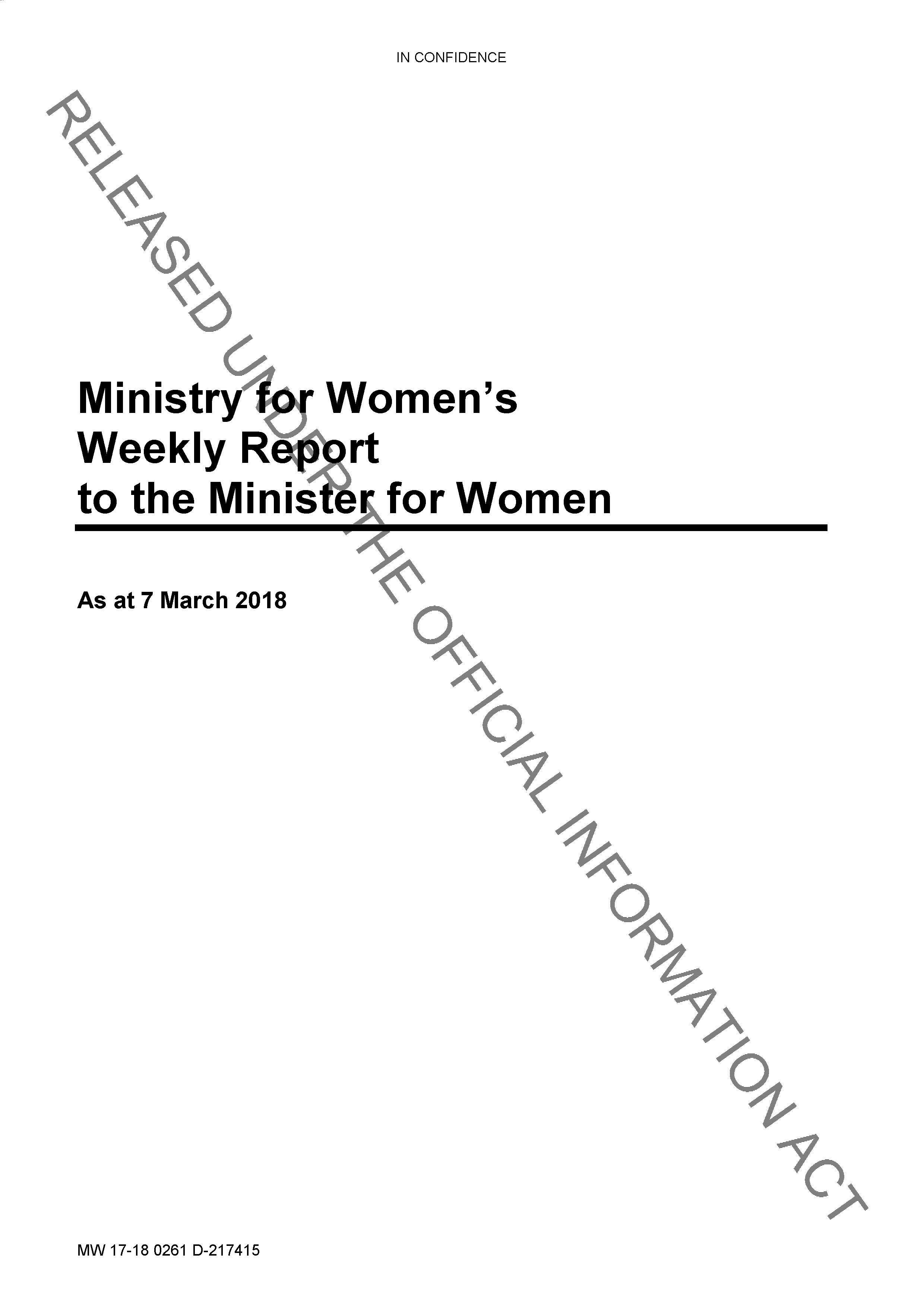 Weekly briefings for "Minister for Women" portfolio: Feb - Aug 2018
