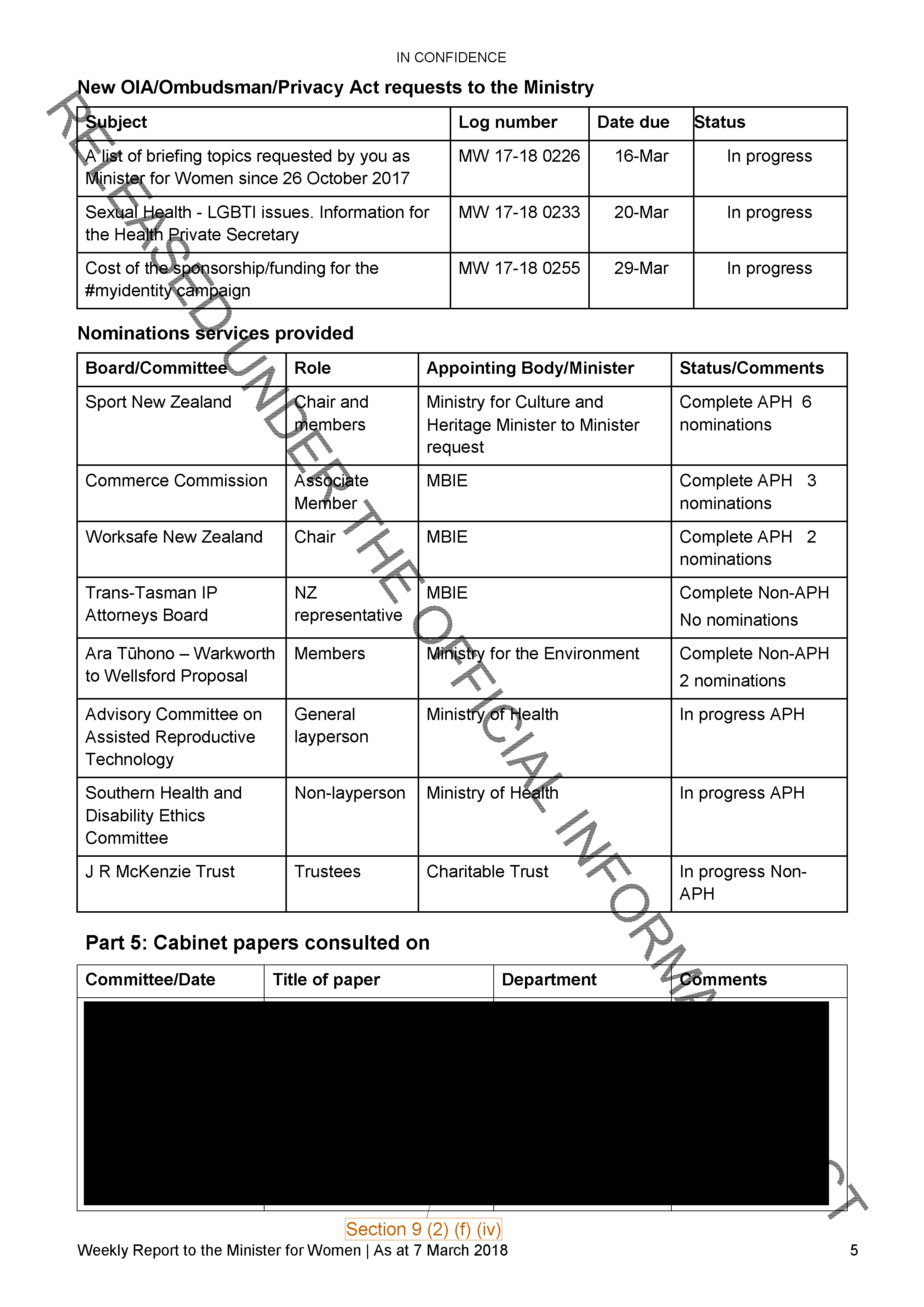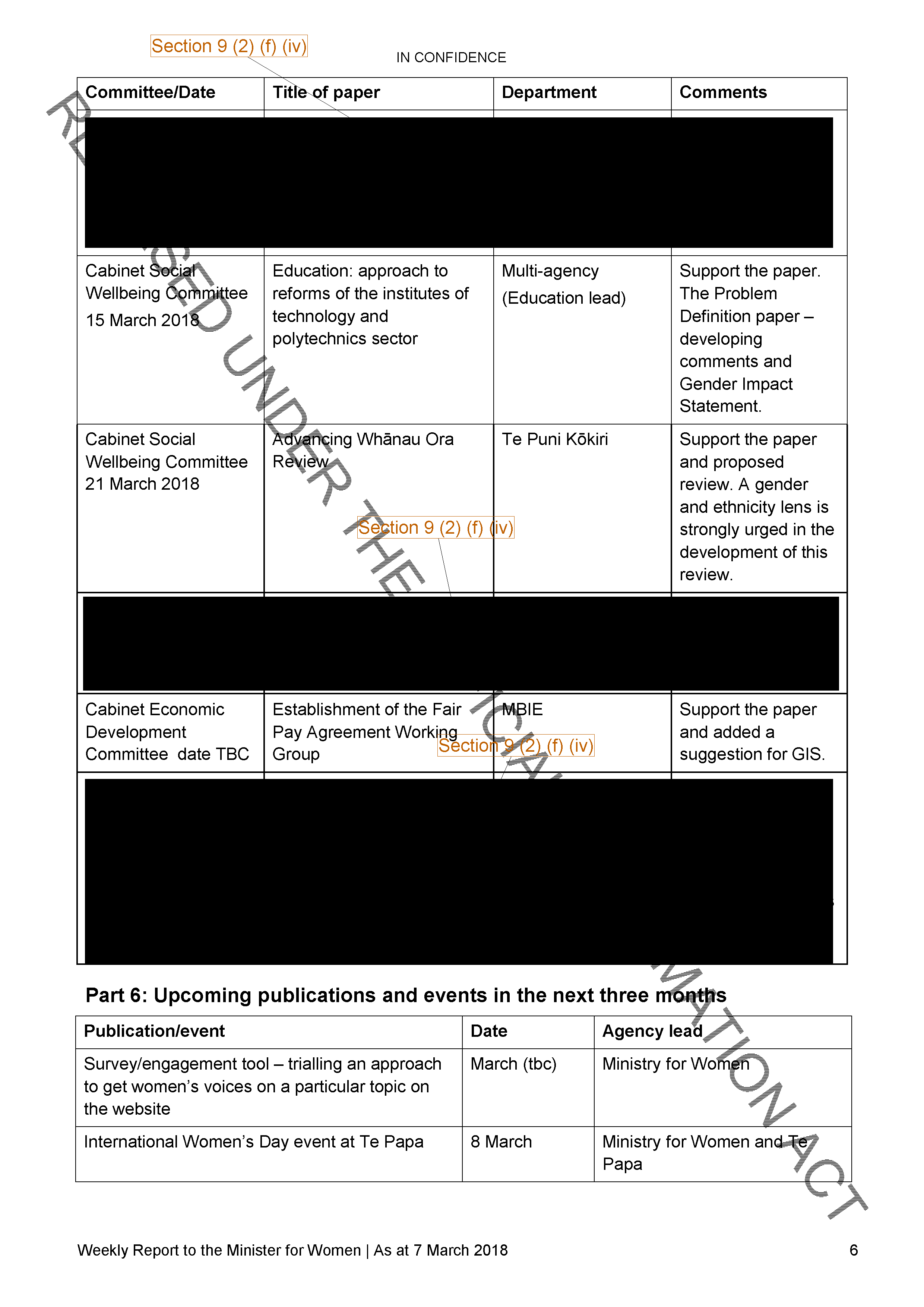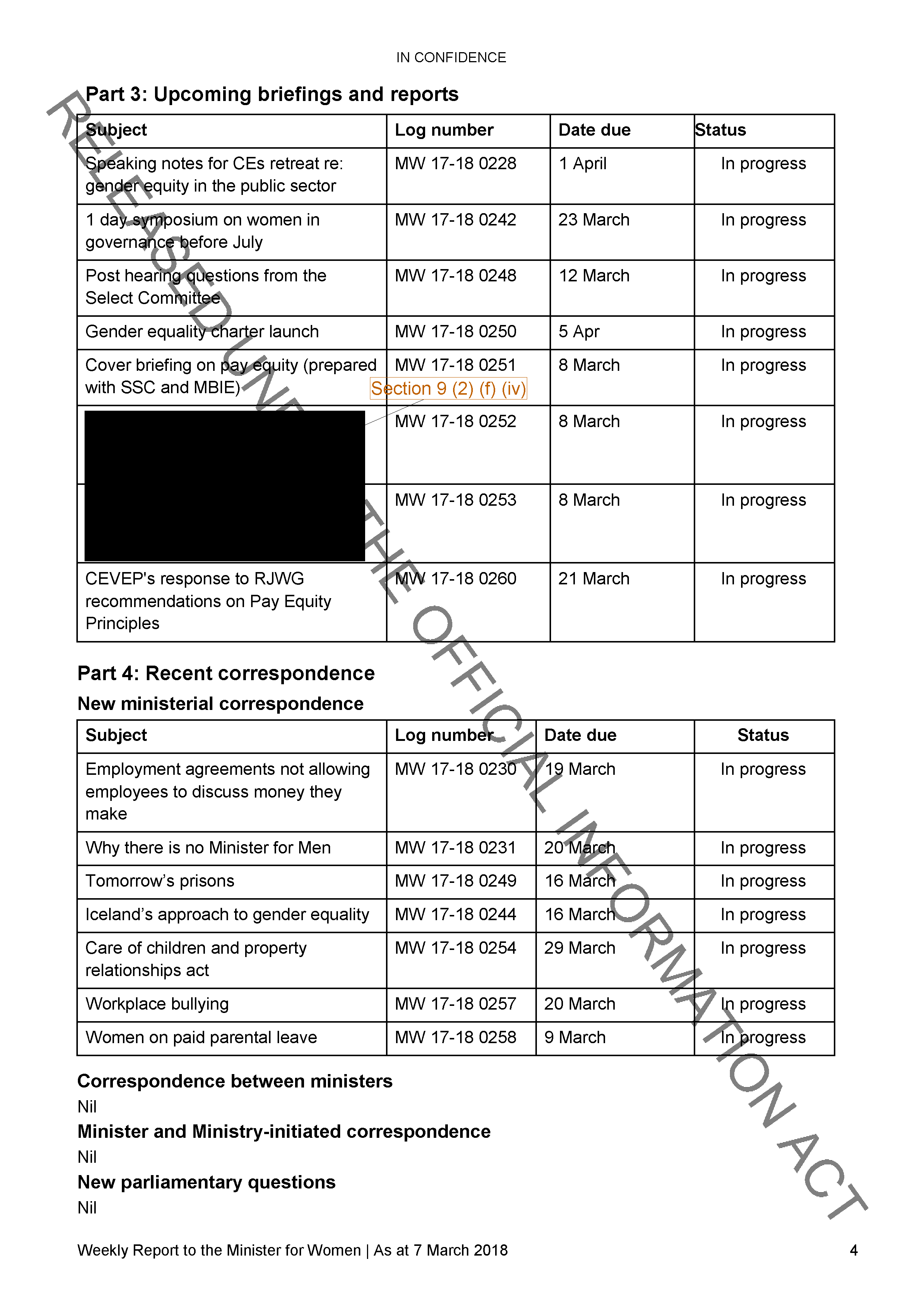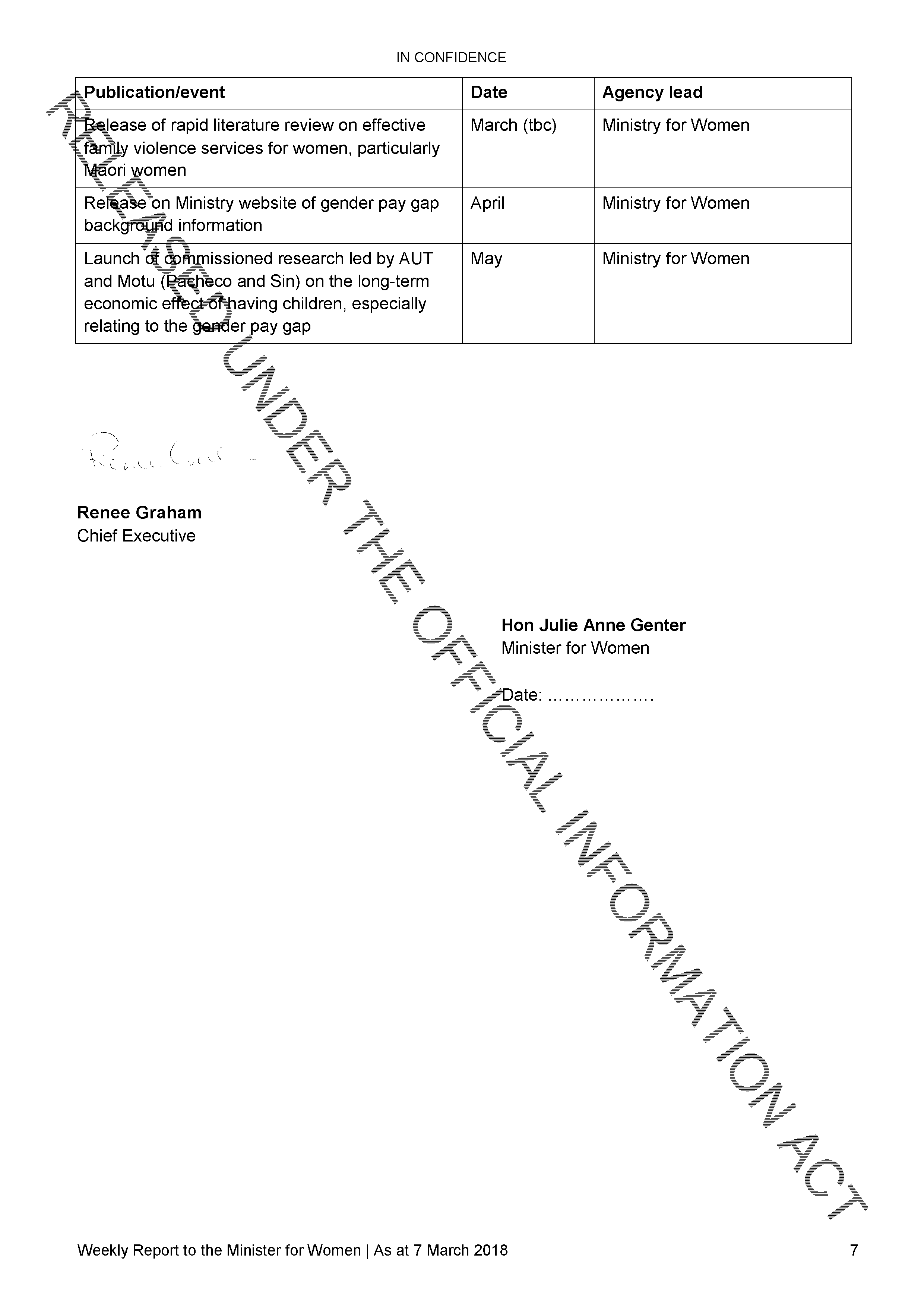 Weekly briefings for "Minister for Women" portfolio: Feb - Aug 2018