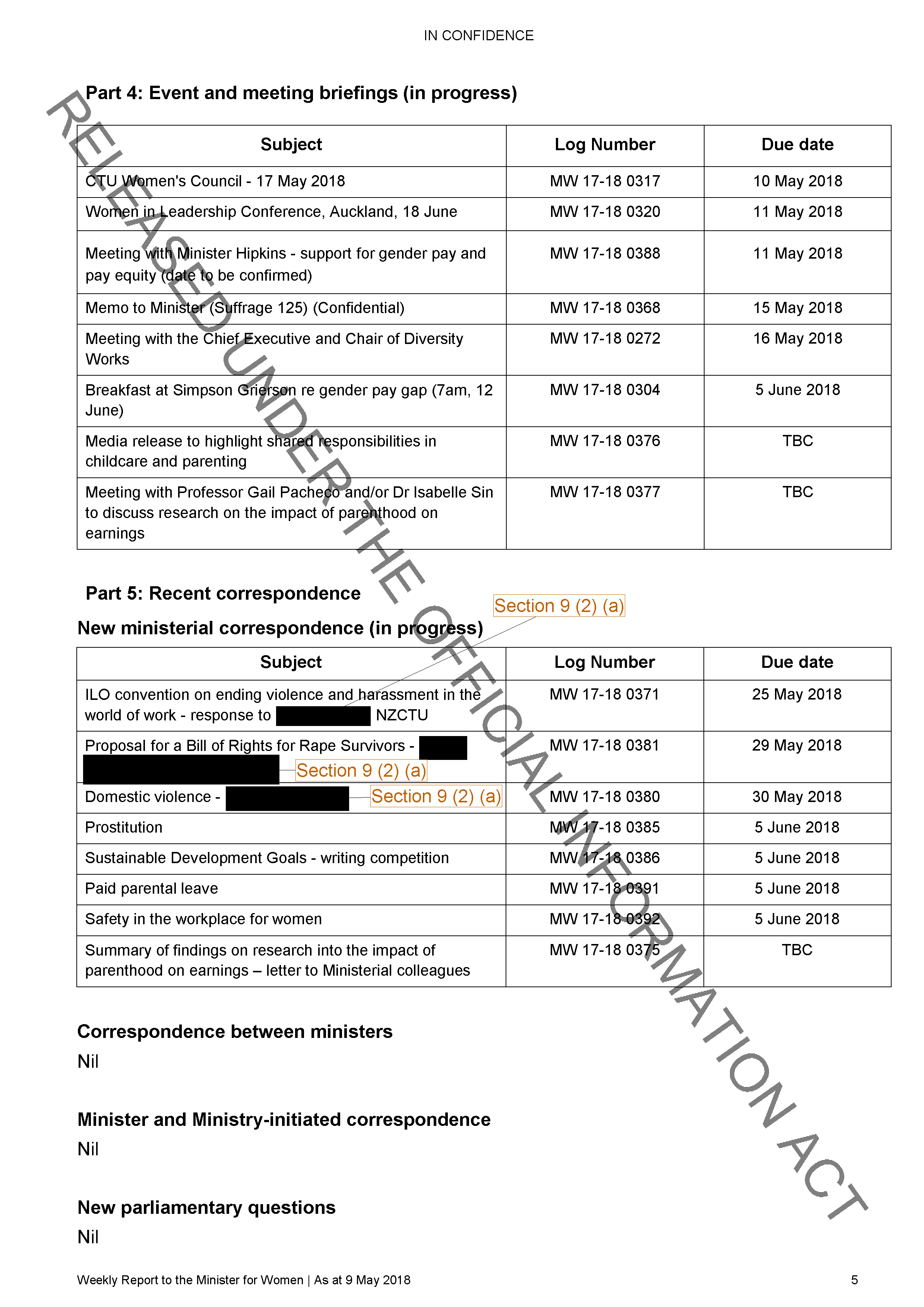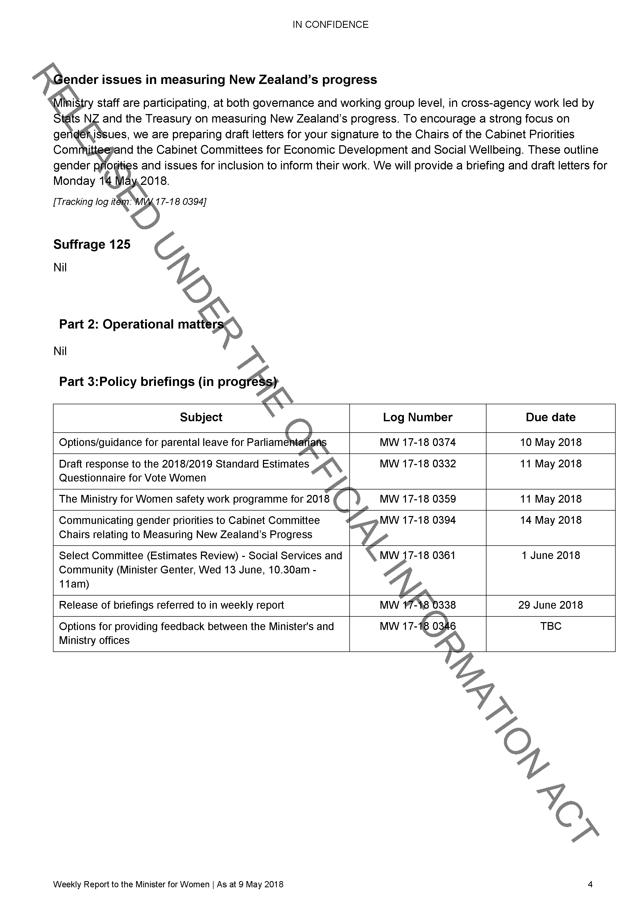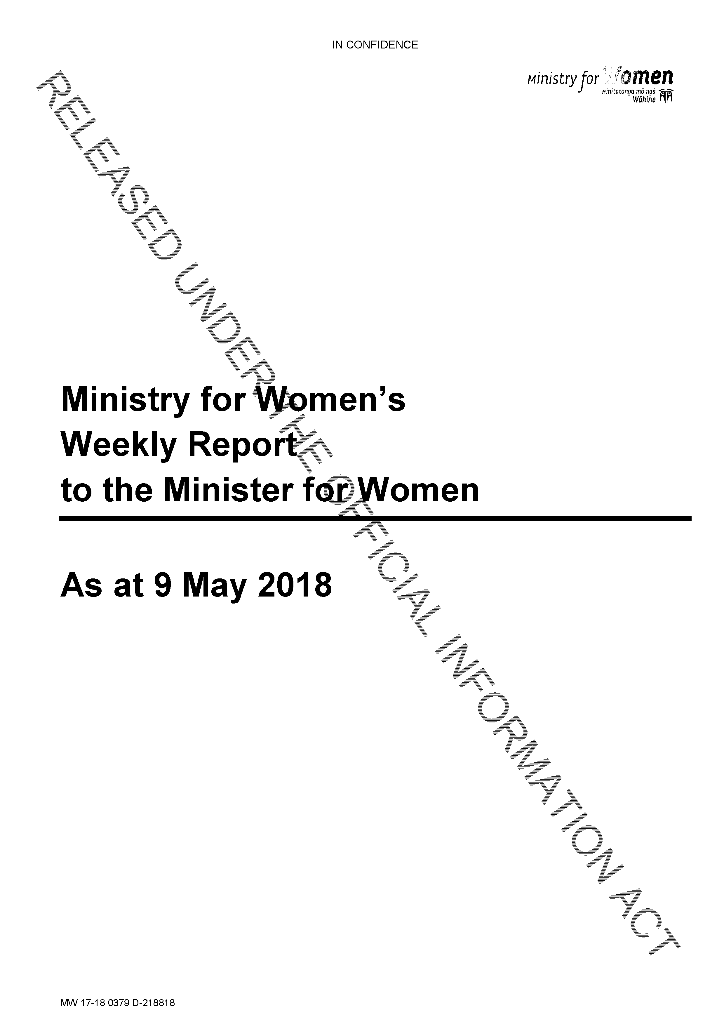 Weekly briefings for "Minister for Women" portfolio: Feb - Aug 2018