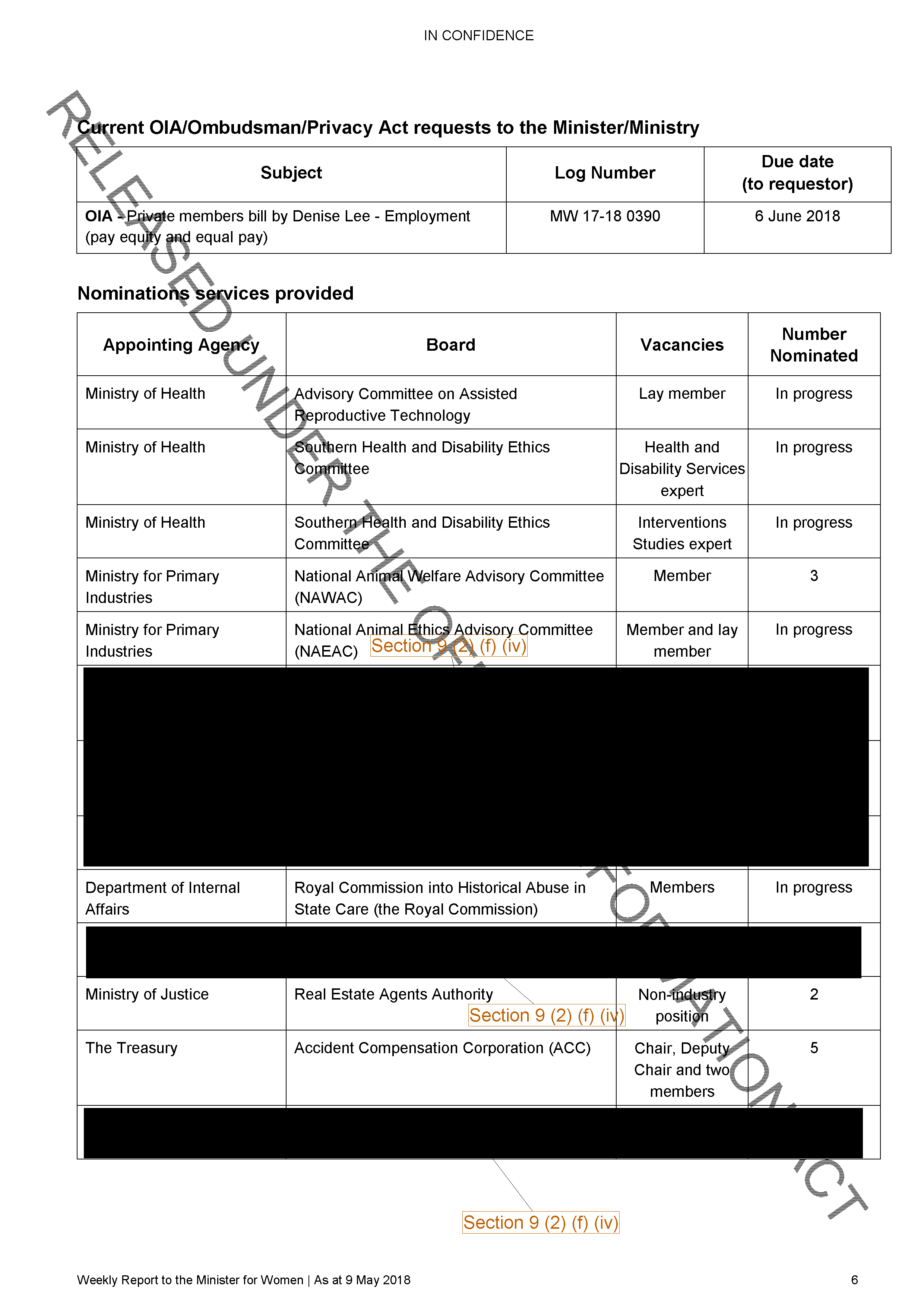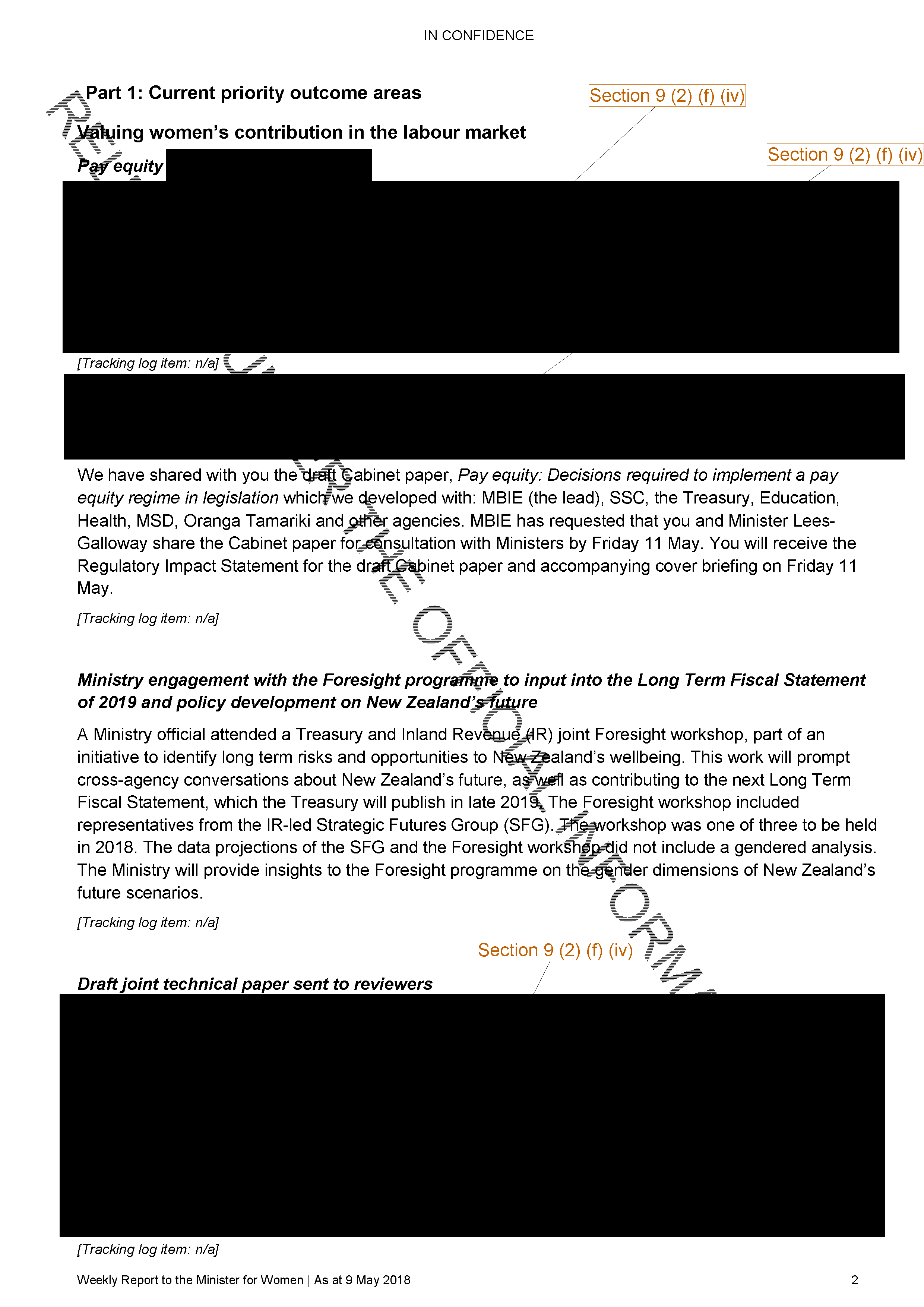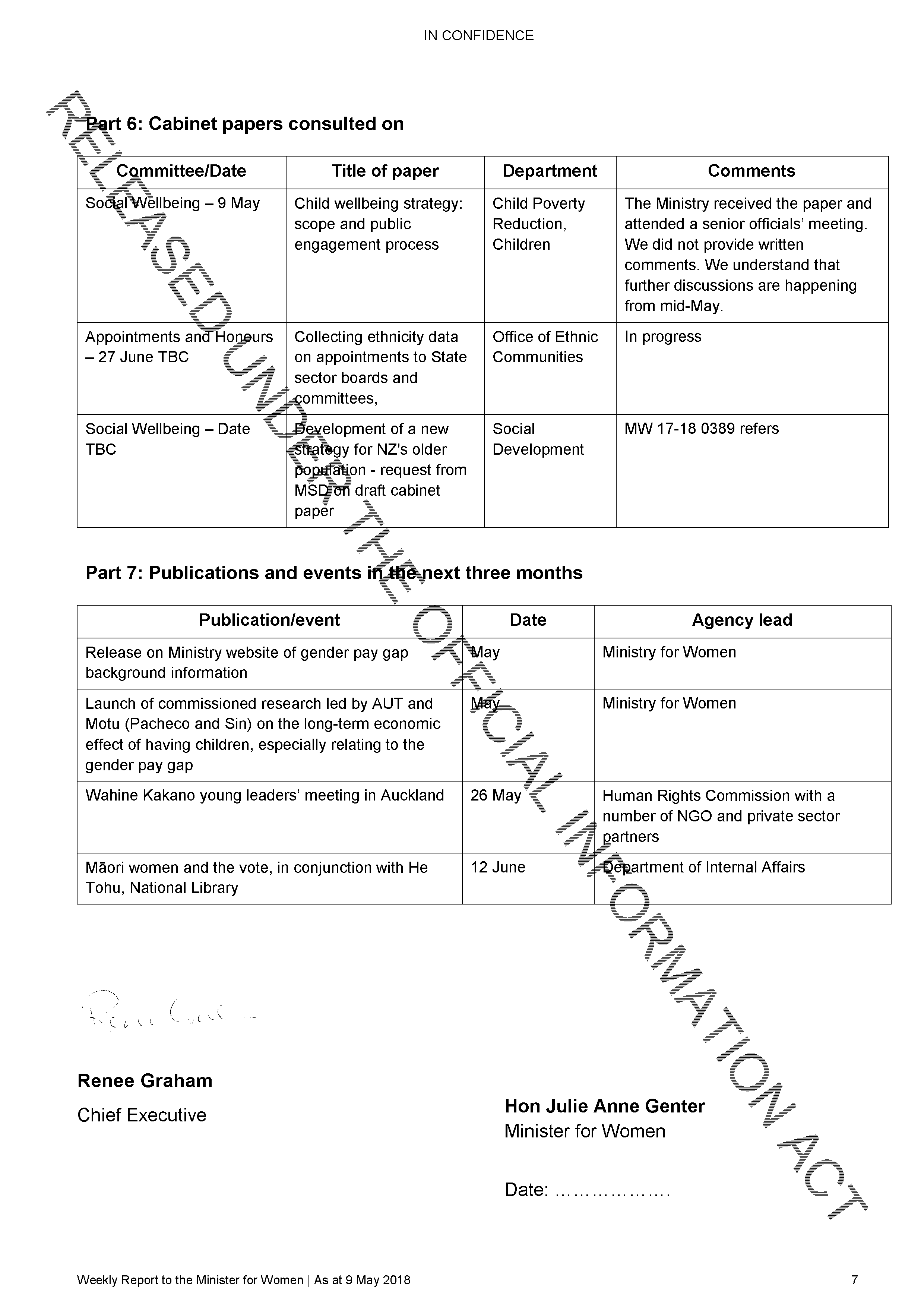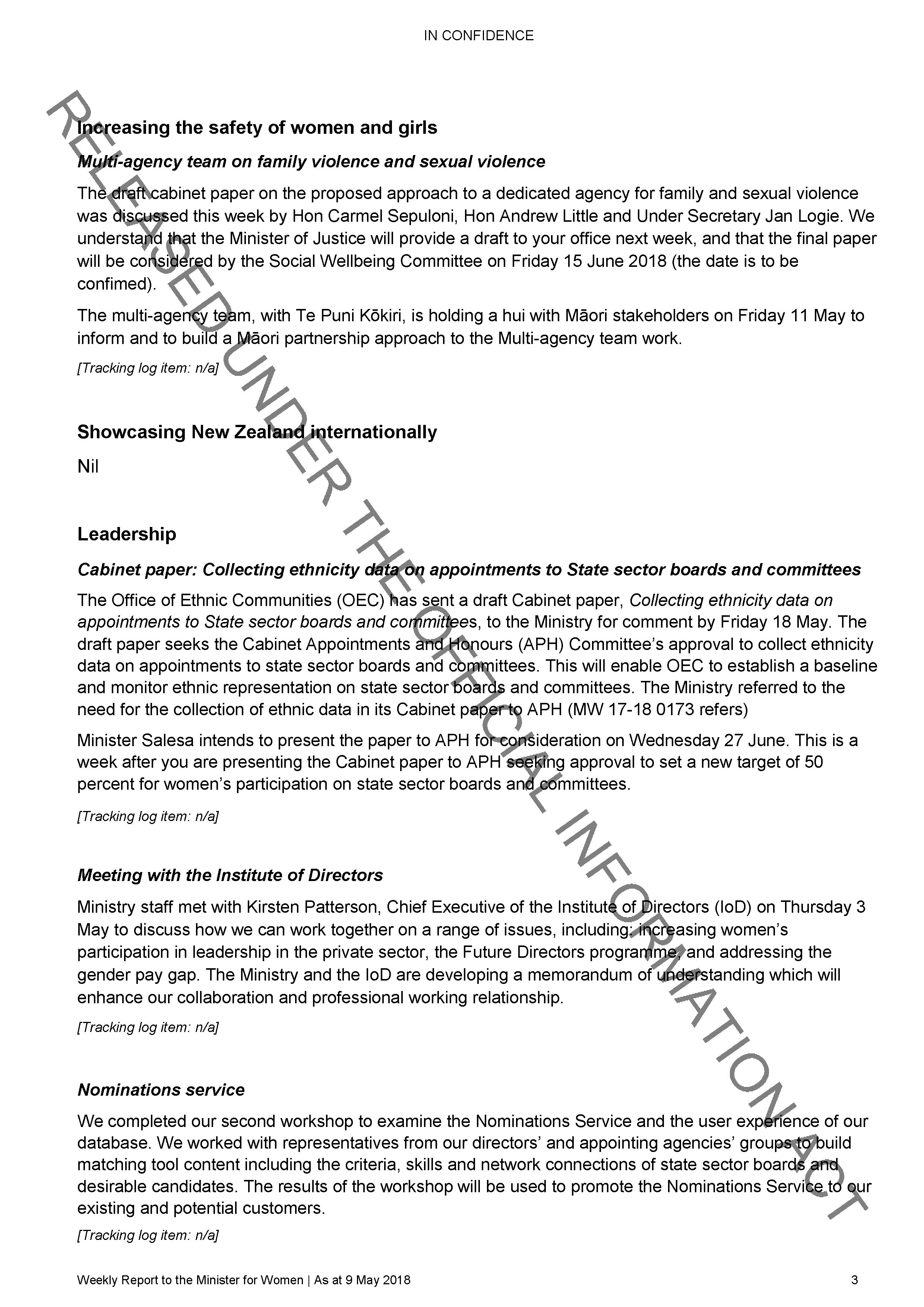 Weekly briefings for "Minister for Women" portfolio: Feb - Aug 2018