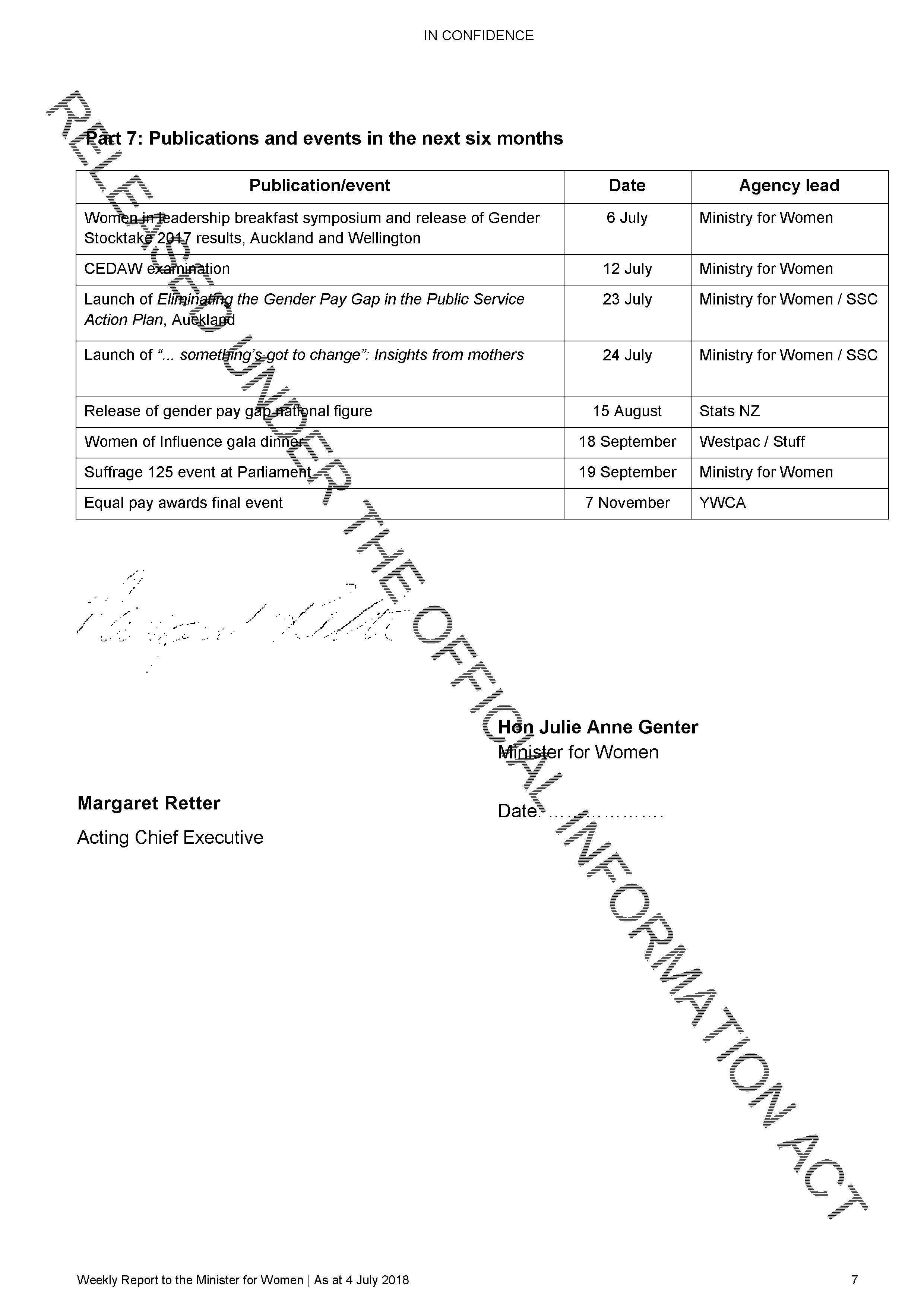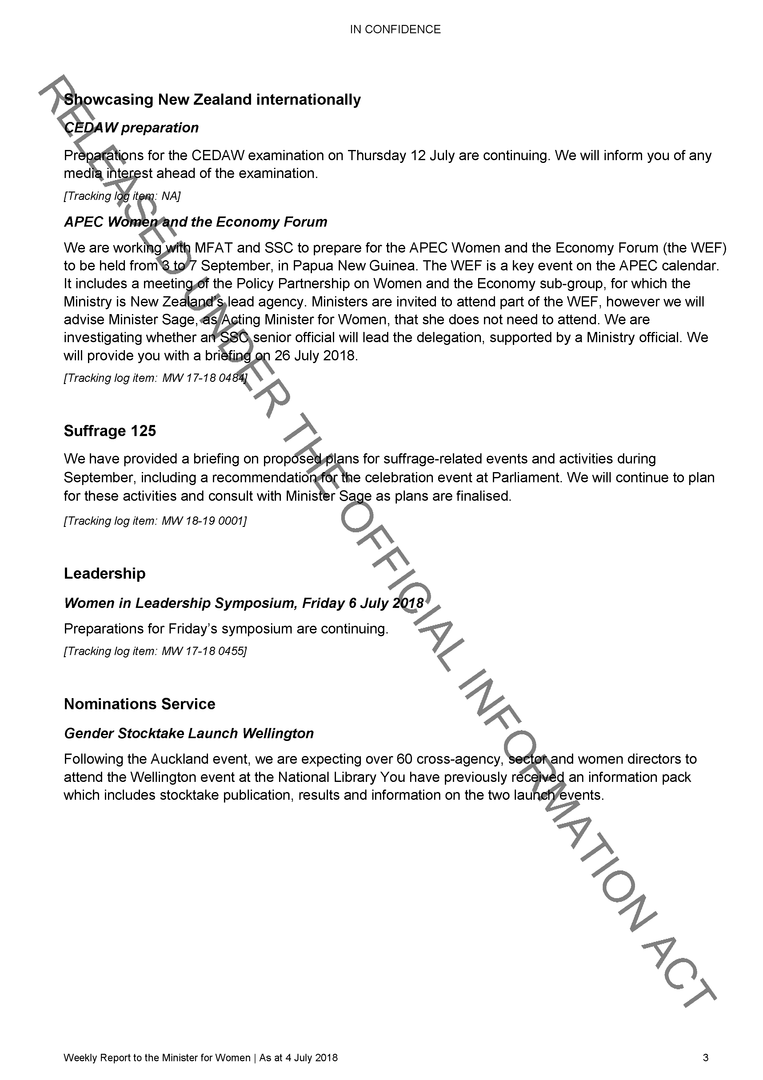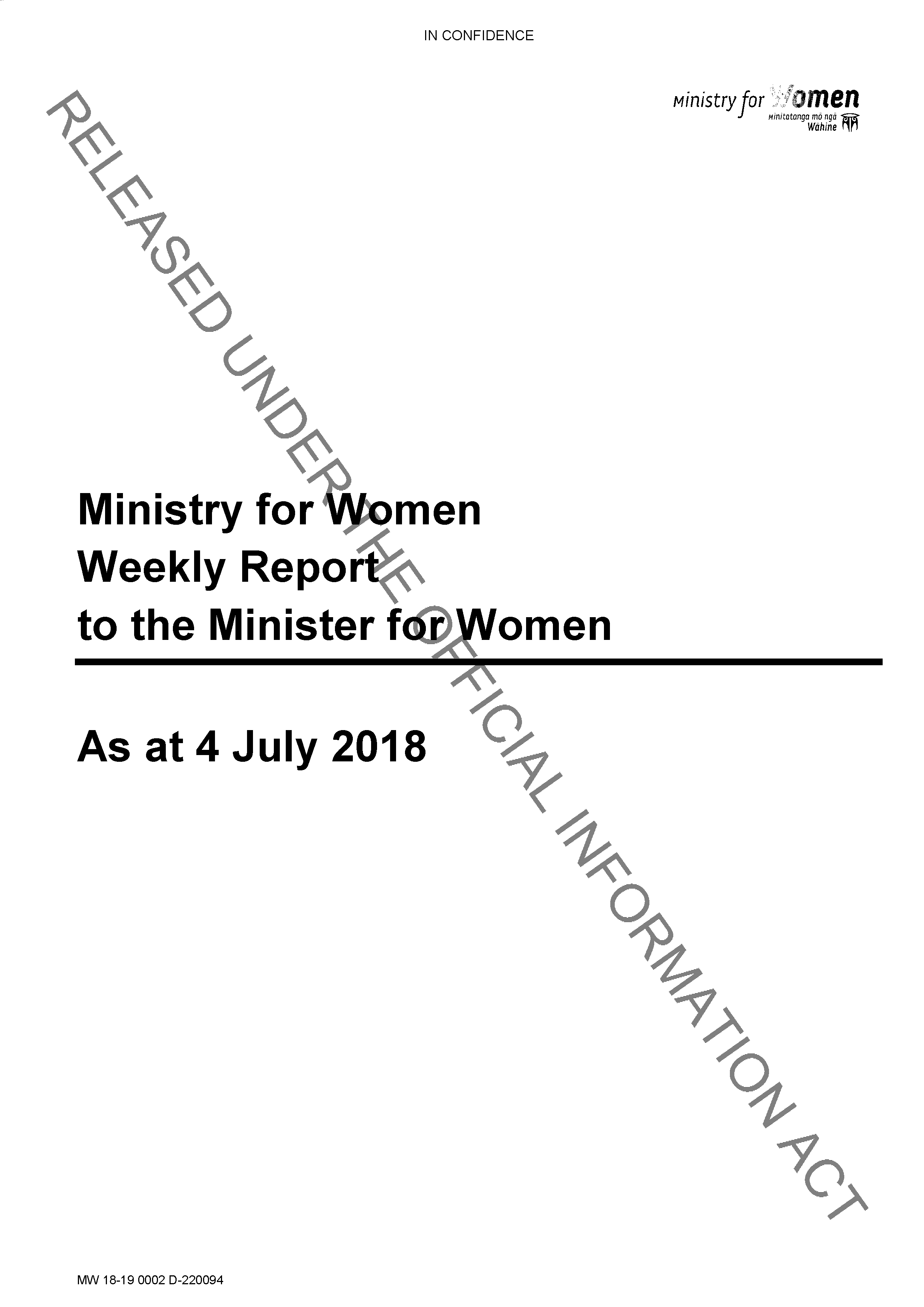 Weekly briefings for "Minister for Women" portfolio: Feb - Aug 2018