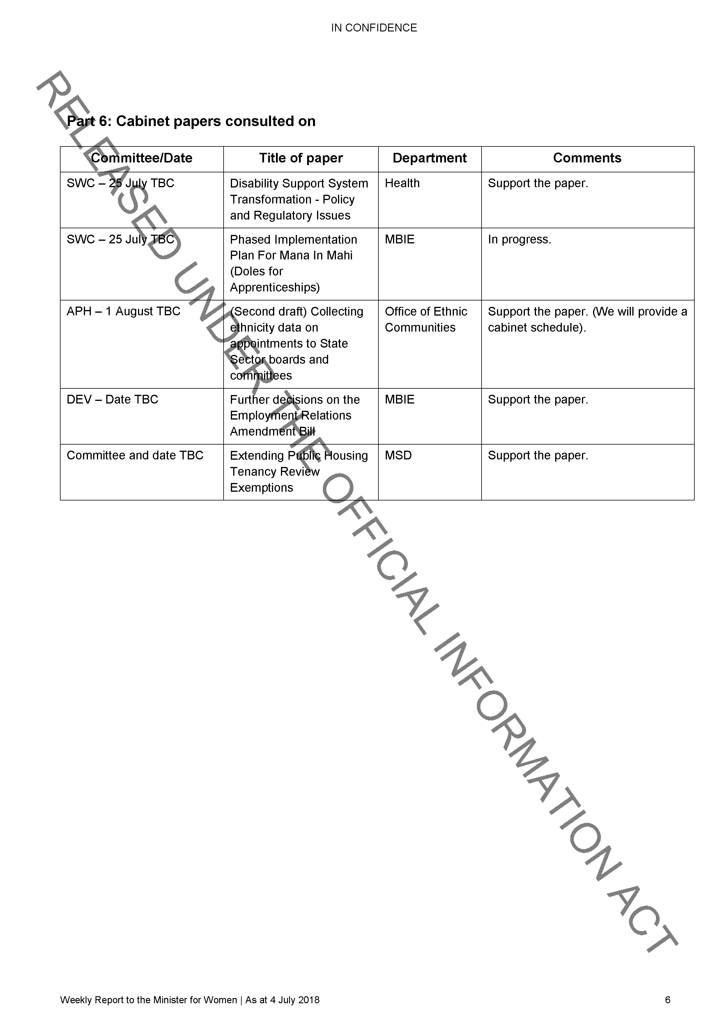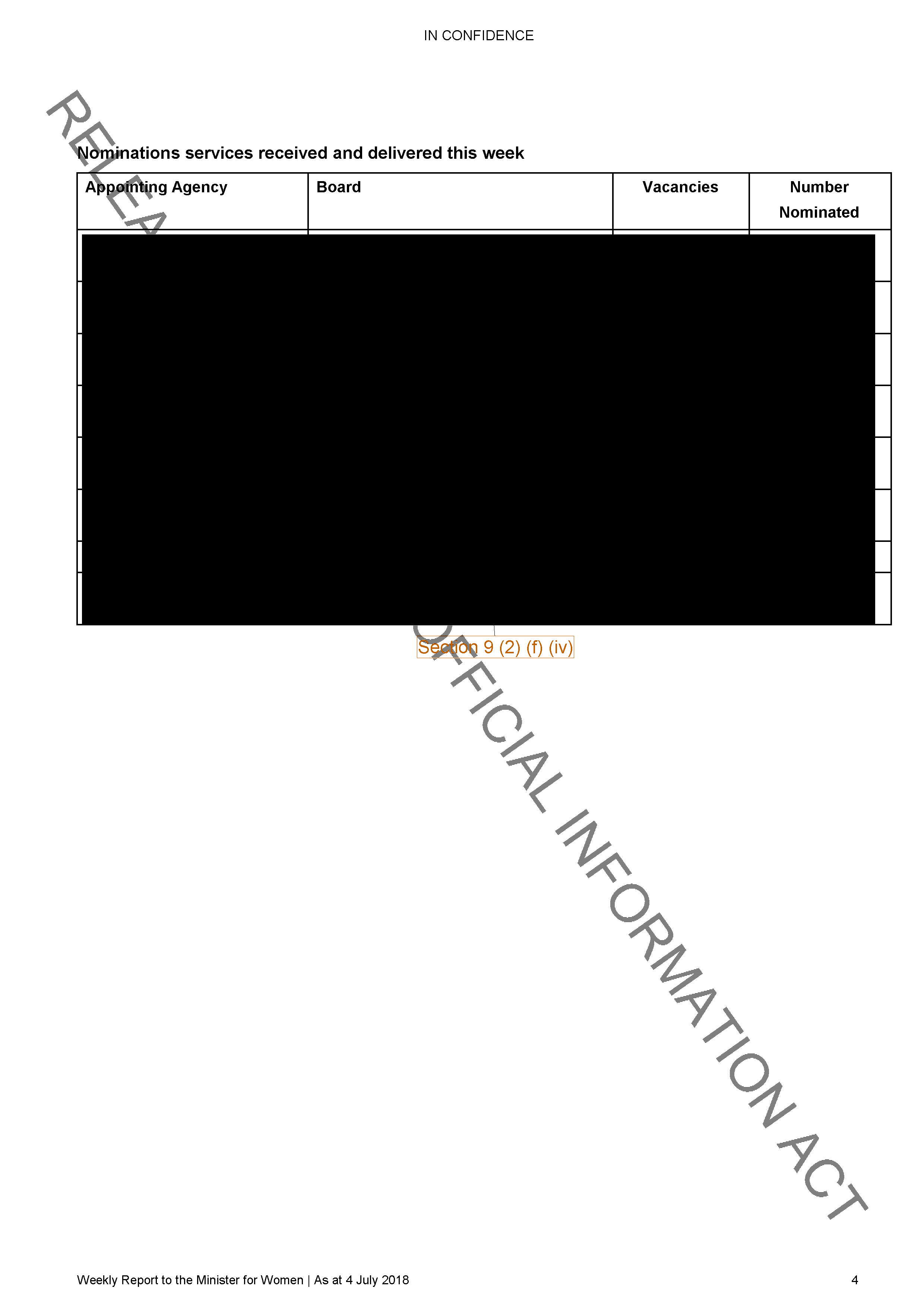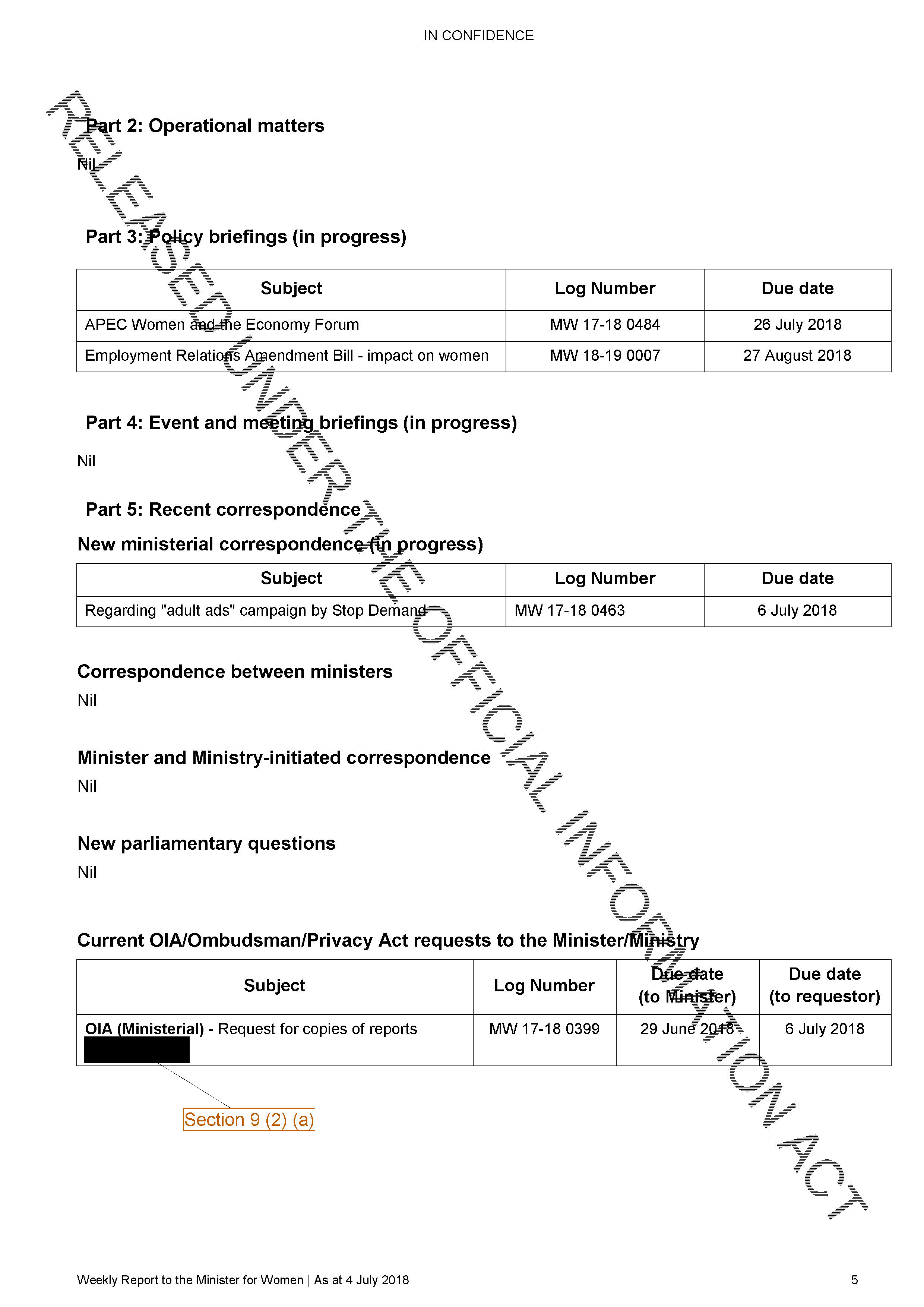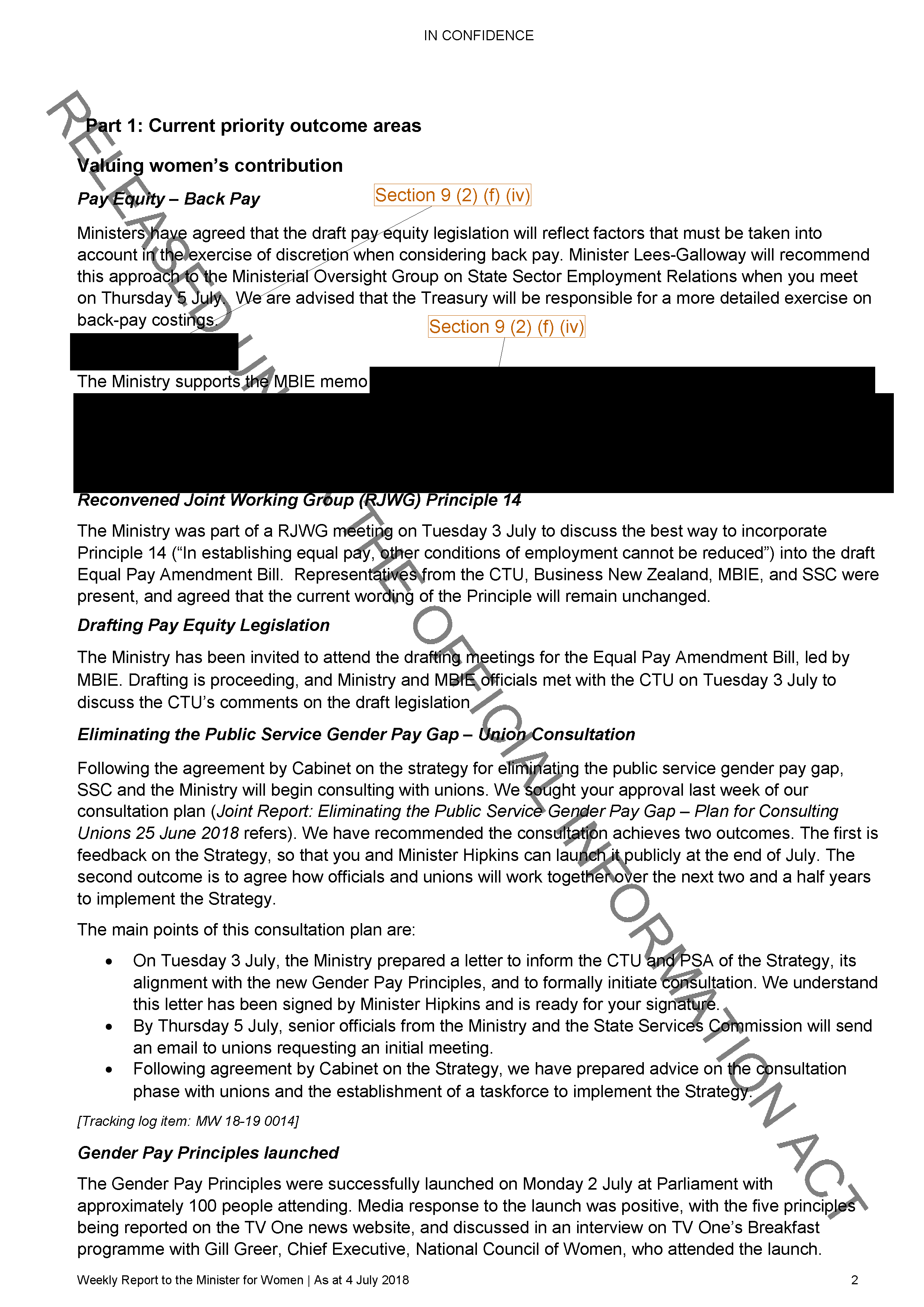 Weekly briefings for "Minister for Women" portfolio: Feb - Aug 2018
