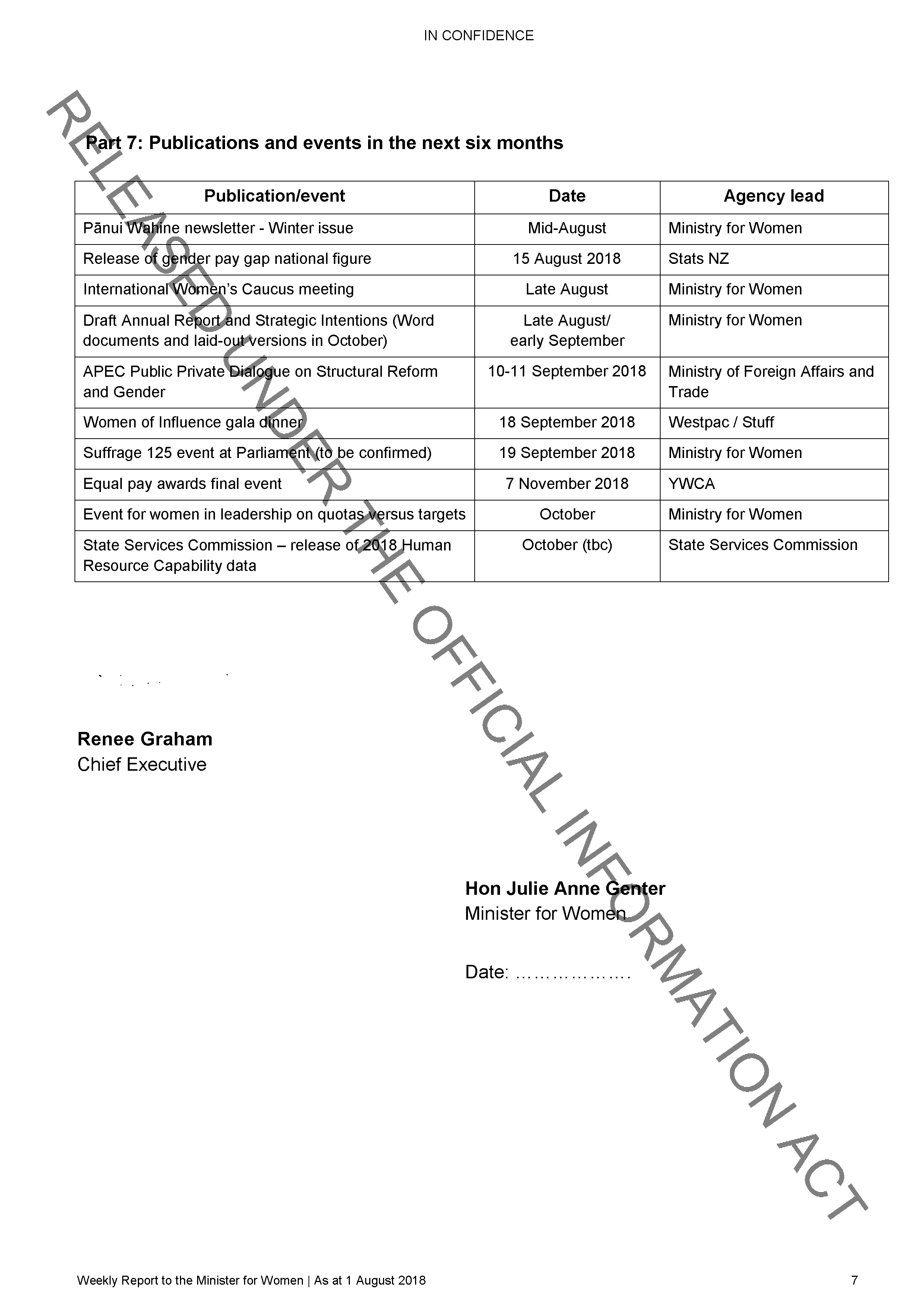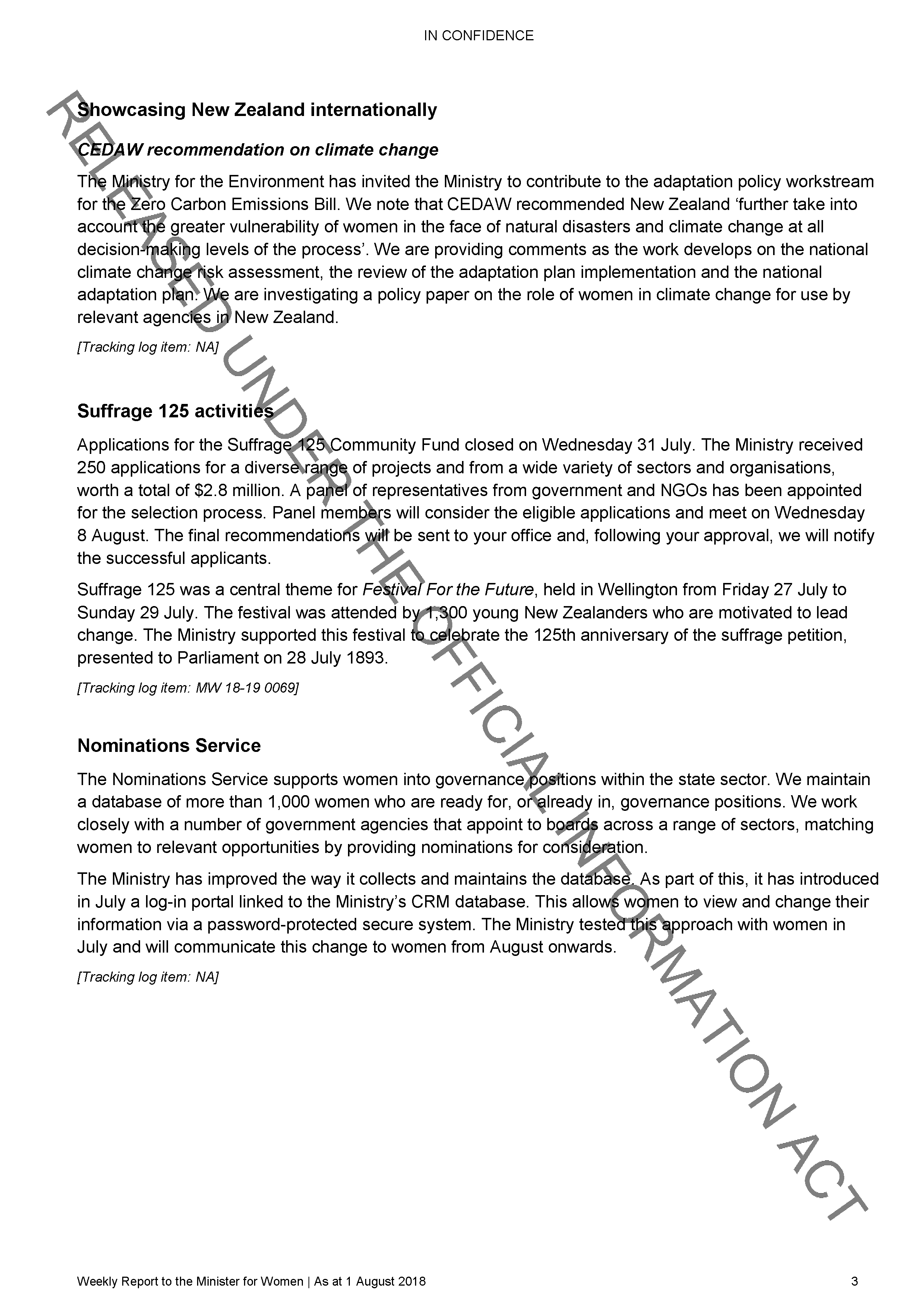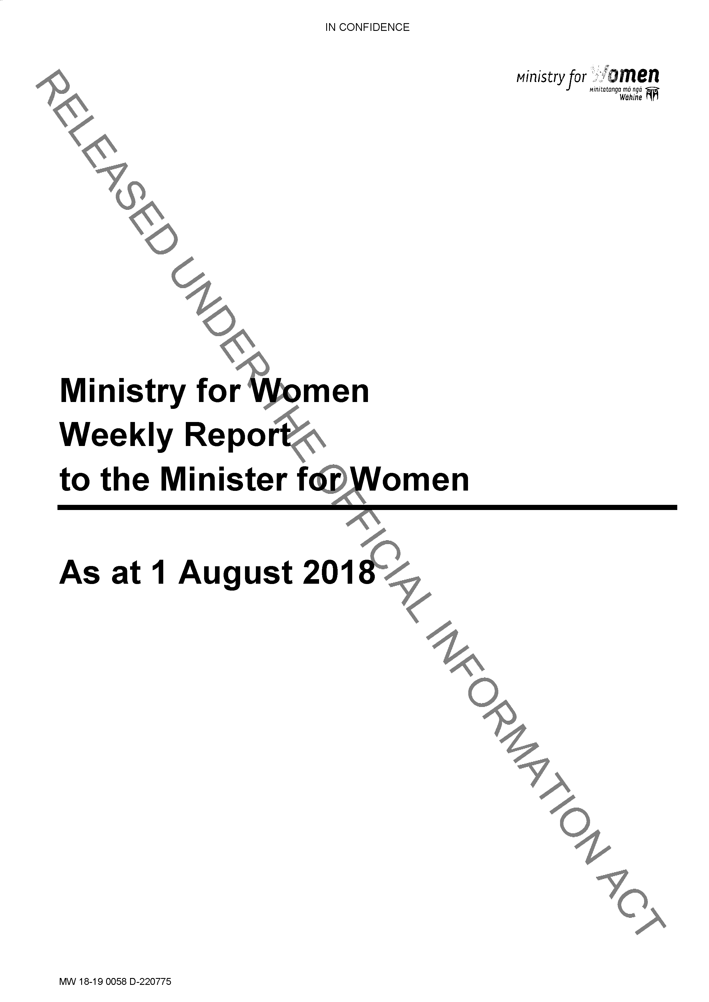 Weekly briefings for "Minister for Women" portfolio: Feb - Aug 2018