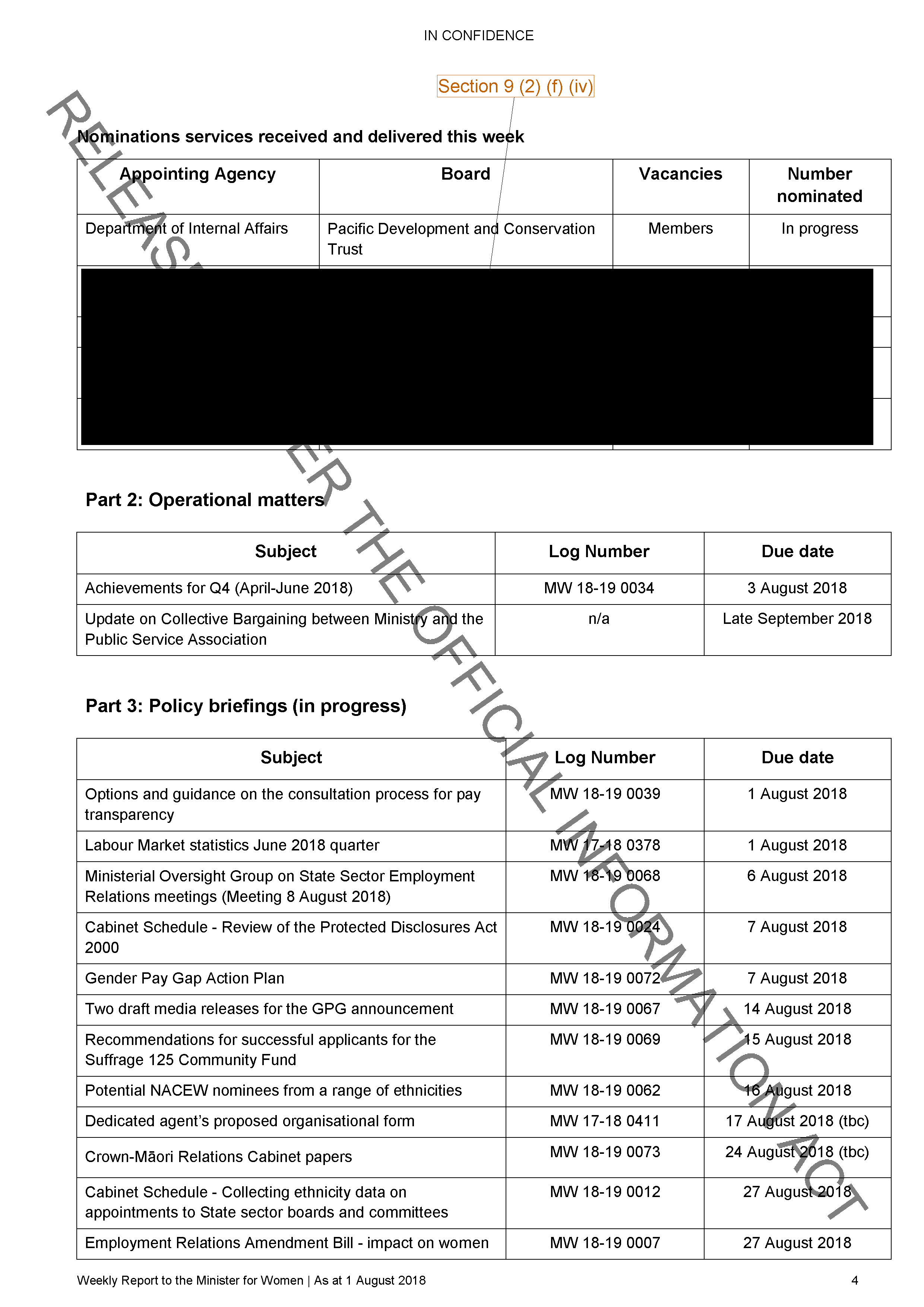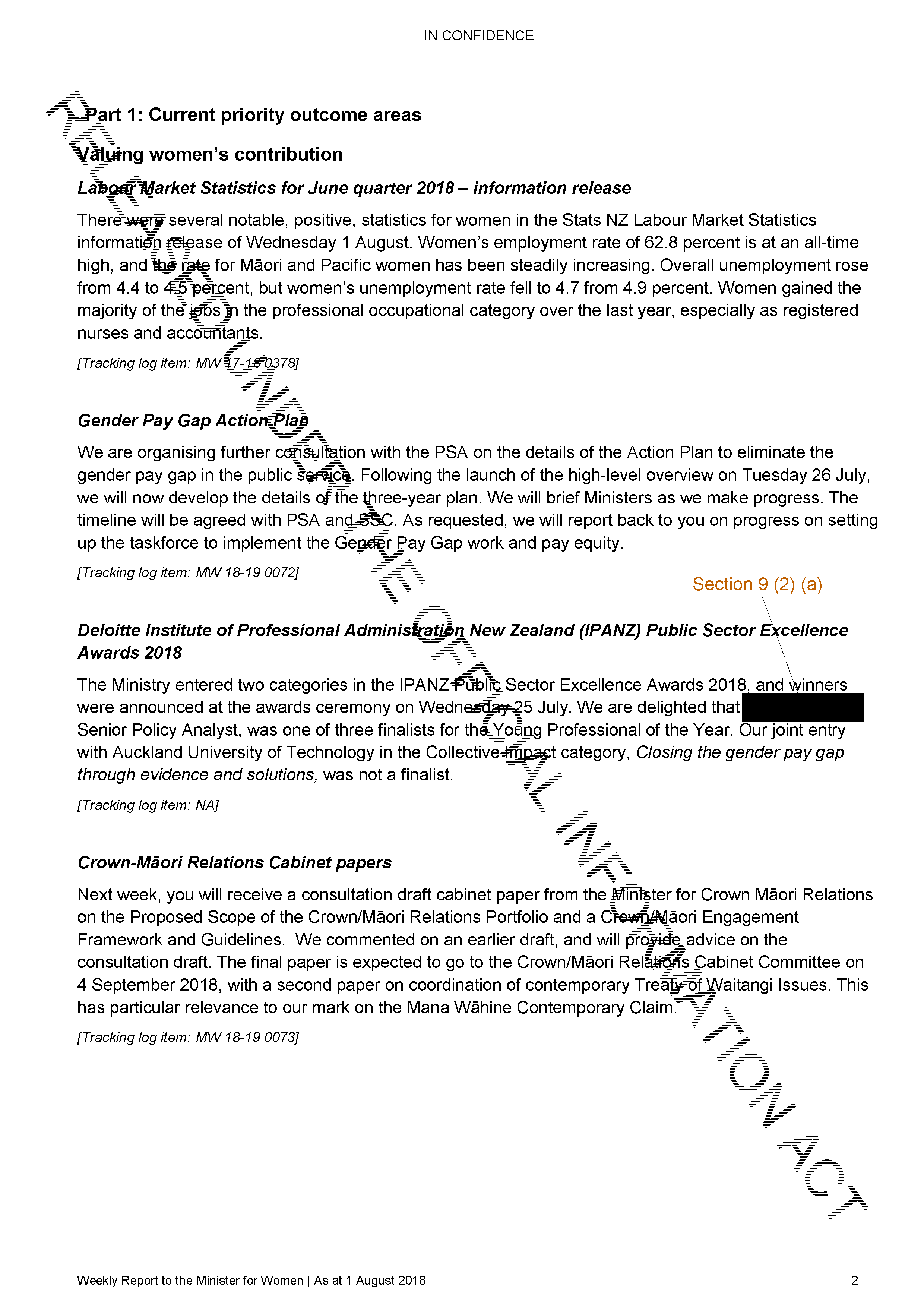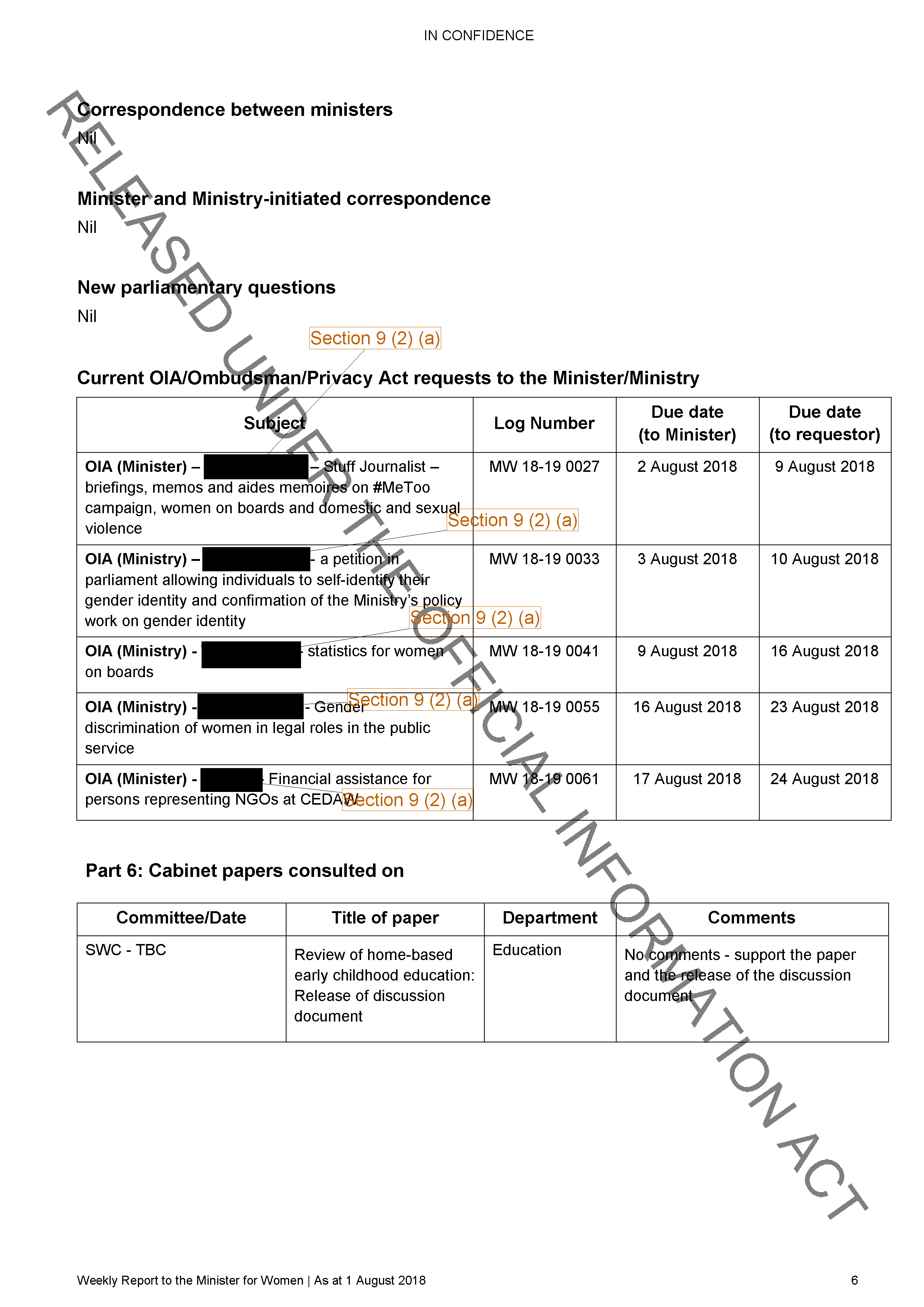 Weekly briefings for "Minister for Women" portfolio: Feb - Aug 2018