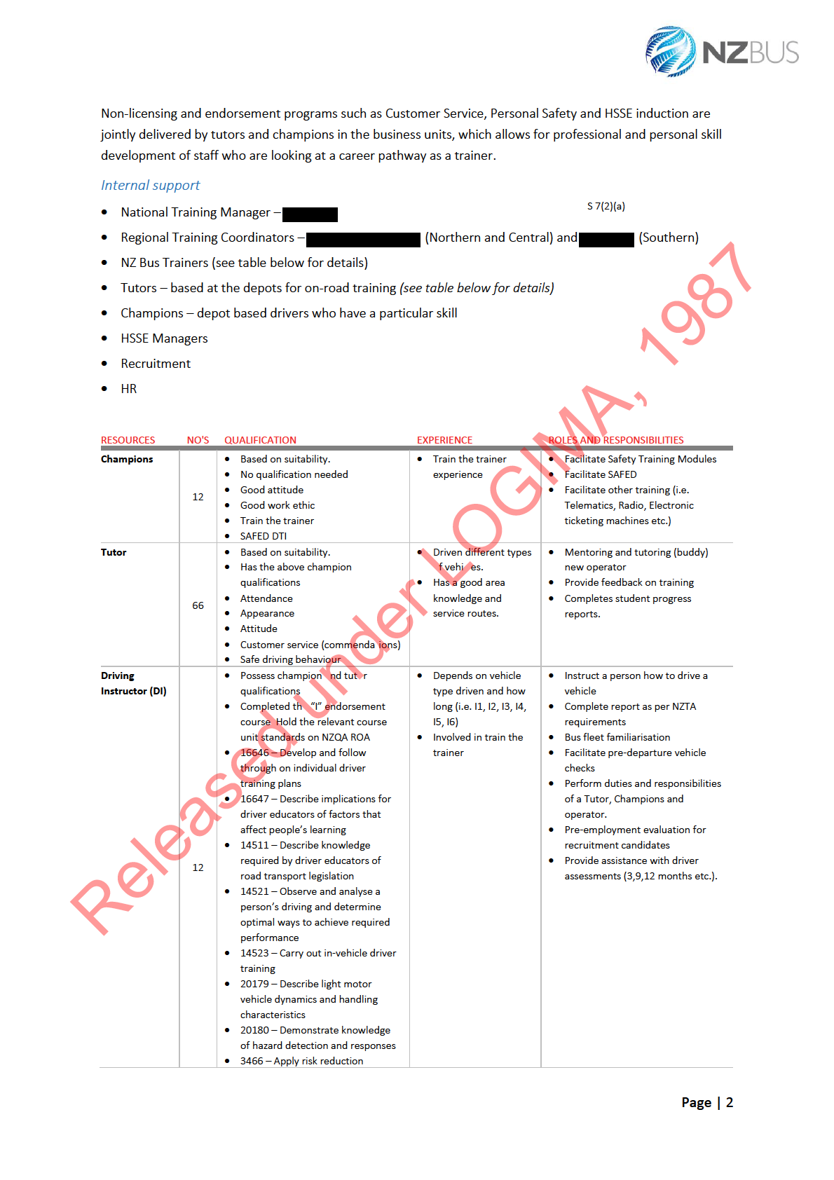 NZ Bus carries out training needs analysis based on staff po itions within the organisation. This process is done