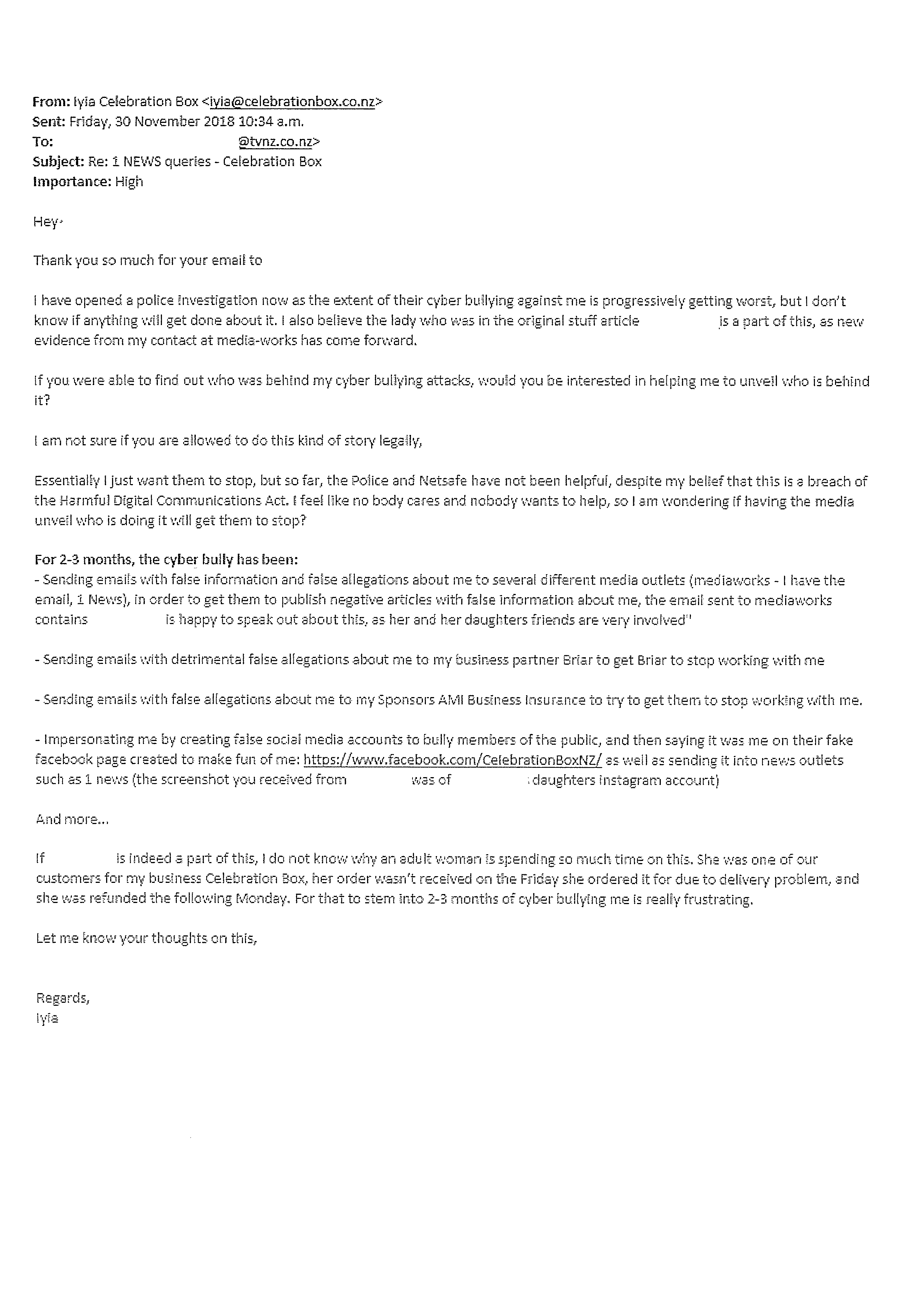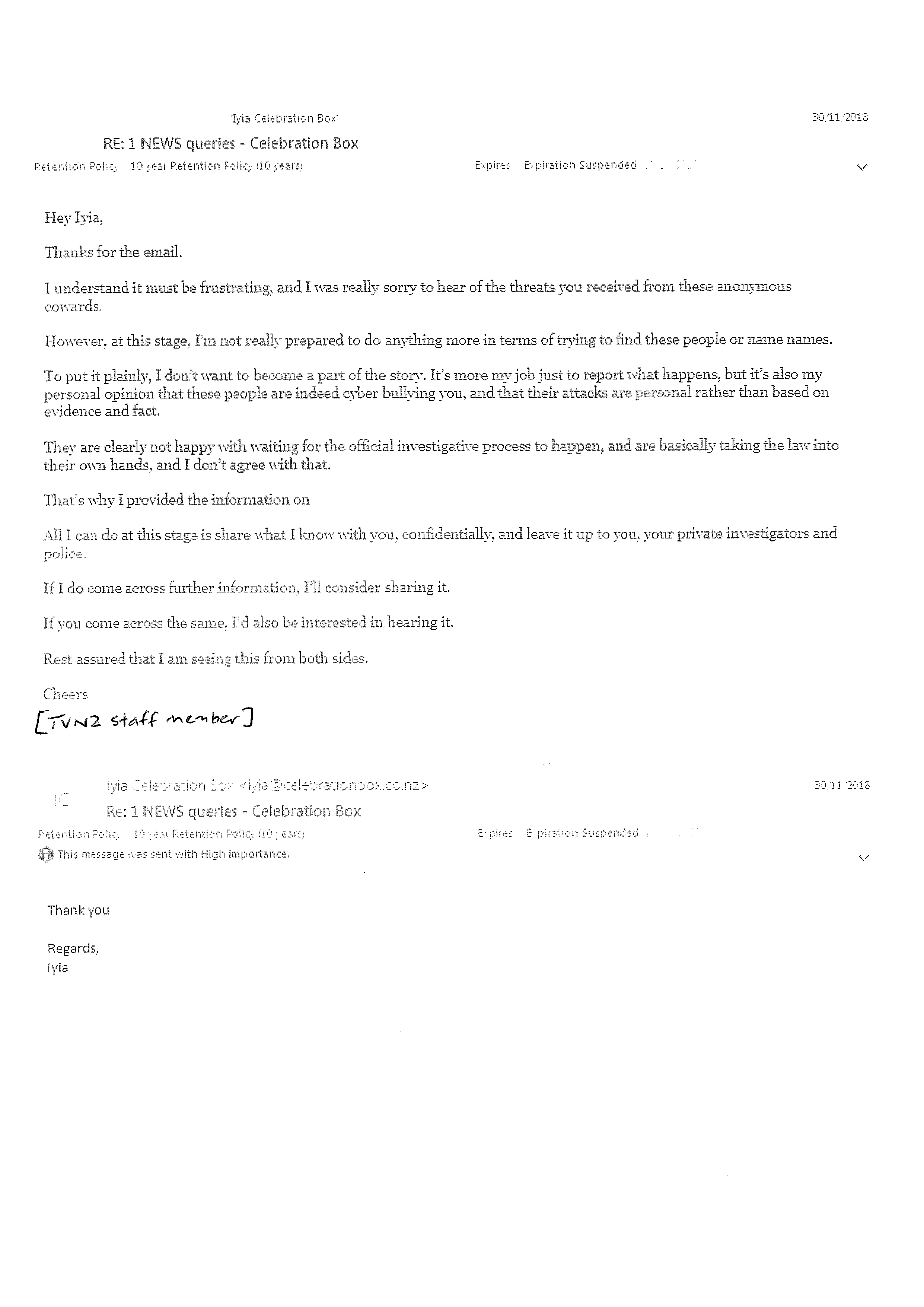 Email Correspondence Between Television New Zealand Staff and Iyia Liu